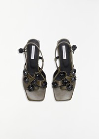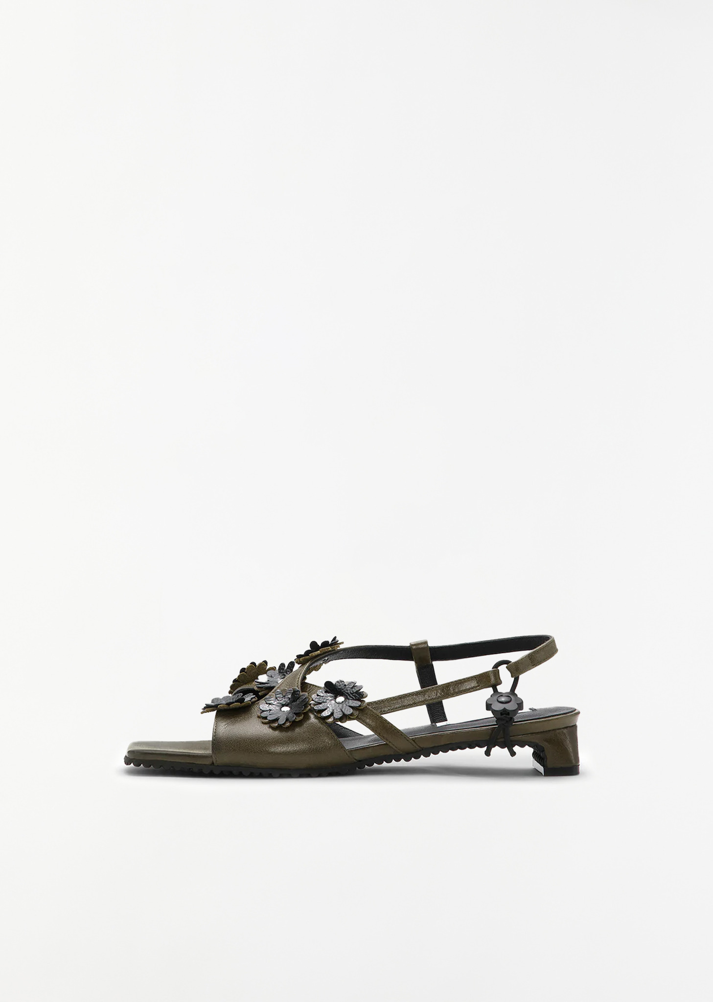 Cecilie Bahnsen olive green sandal with overlapping design and six delicate patent flower appliques in leather. Features a kitten heel, drawstring closure detailed with a black floral motif, and rubber sole. Sizing: European (36-41). Color: Olive. Upper: 100% Cow Leather, Lining: 100% Goat Leather, Outsole: 97% PVC, 3% Rubber. Imported. PS25CB021