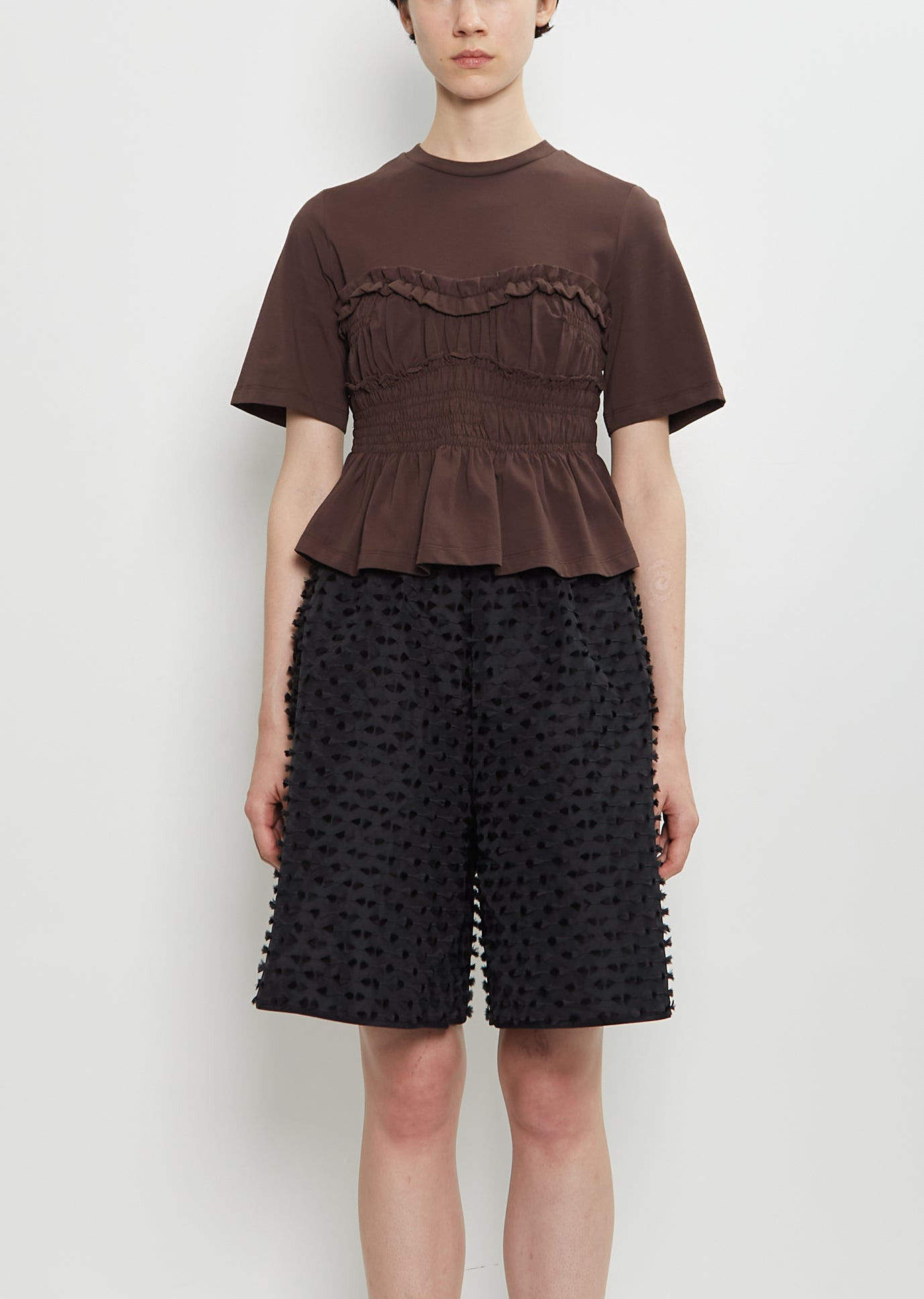 Cecilie Bahnsen brown short sleeve t-shirt with crew neckline a ruched bodice in stretch cotton jersey. Peplum silhouette with a closer fit. Worn with: Brooks Technical Joggers and RX Marie-Jeanne — Black . Sizing: Universal (XS-L). Effy is 5'10” (178cm), bust 30.5”, waist 23”, hips 33” and wears a size small. Color: Brown. 90% Cotton, 10% Elastane. Imported. PF25CB014