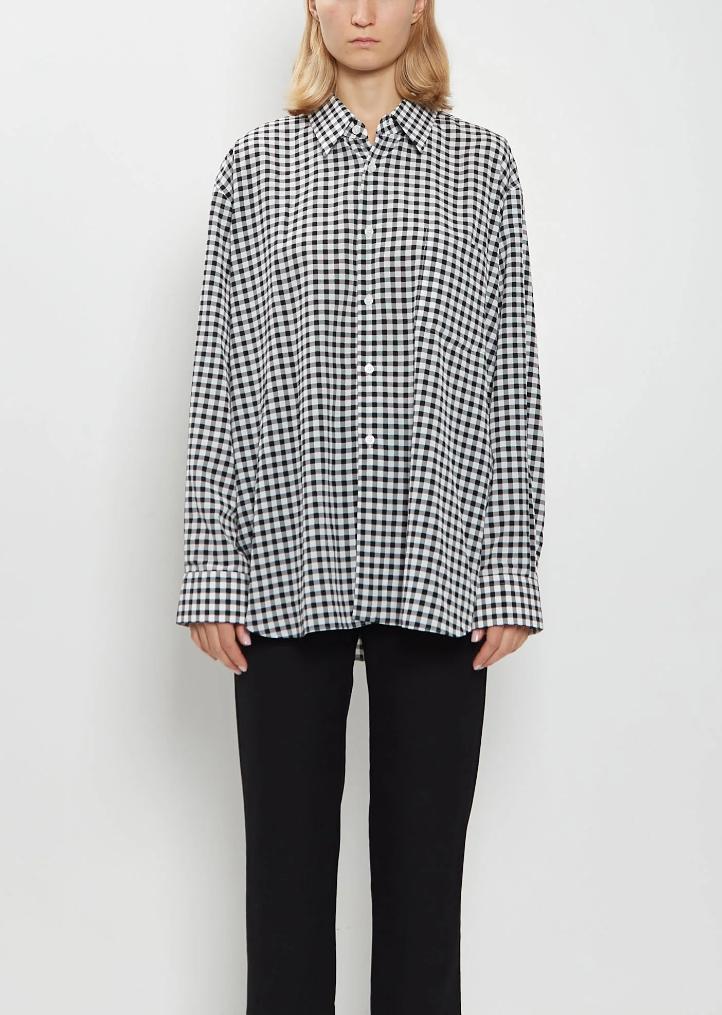 Comme des Garcons black and white checkered shirt with a classic collar and shell-hued button front in lightweight polyester poplin. Features dropped shoulders, a chest patch pocket, buttoned cuffs, slightly curved hem, and box pleat at back yoke. Sizing: Universal (XS-L). Alina is 5' 9” (175cm), bust 31”, waist 23", hips 34” and wears a size small. Color: Black / White Small. 100% Polyester. Made in Japan. FW25CDG05