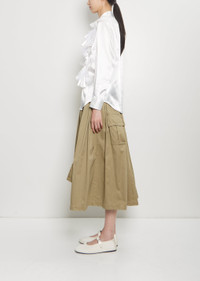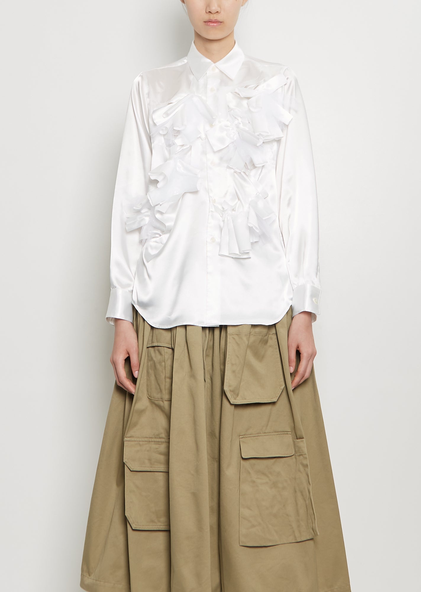 Comme des Garcons Comme des Garcons white blouse with a classic collar and tulle ruffle applique details in satin. Features buttoned cuffs, curved hem, box pleat at back yoke, and a shell-hued button front closure. Sizing: Universal (XS-L). Mingyi is 5'11” (180 cm), bust 31”, waist 23”, hips 35” and wears a size small. Color: White / White. 100% Polyester, Attach: 100% Nylon. Made in Japan. SS25CCG19
