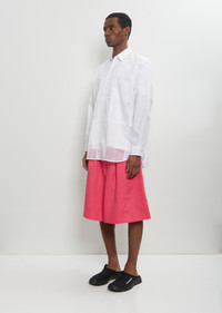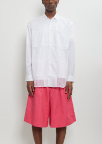 Comme des Garcons Homme Plus white button up shirt with patchwork mesh panels throughout in cotton poplin. Features a pointed collar, chest patch pocket, buttoned cuffs, curved hem, and box pleat at back yoke. Worn with: Polyester Long Shorts and RX Slide 3.0 — Black/Scarab/Eden . Sizing: Universal (S-XL). Amani is 6'1" (185cm), chest 37”, waist 29”, and wears a size medium. Color: White. 100% Cotton. Made in Japan. SS25HPM02