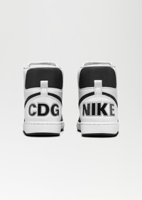 Comme Des Garçons Homme Plus x Nike Terminator High. First introduced in 1985 as Nike’s first signature shoe for a college basketball team, Comme des Garçons Homme Plus updates the silhouette to feature a black color block panel with a matching Swoosh and CDG branding displayed on the heel made in premium leather. Features a perforated toe box for breathability, a padded collar and tongue for comfort, and a pronounced pull tab and unique lacing system. Finished with contrasting rubber outsoles that continue the color way. Additional black laces included. Sizing: Women's sizes (5-13) / Men's sizes (3.5-11.5) Color: Black. 100% Leather. Sole: 100% Rubber. Imported. SS23HPM011