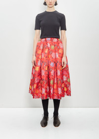 Comme des Garcons red pull-on skirt with a pleated waist in polyester satin with a multicolored jacquard pattern. Features an elasticated waistband and side seam pockets. Comes unlined. Worn with: Cotton Mini Boy Tee — Jet Black and Awar Lace Up — Laquer Brown . Sizing: Universal (XS-L). Mila is 5' 9.5” (177cm) , bust 30”, waist 24”, hips 35” and wears a size small. Color: Red / Multi. 100% Polyester. Made in Japan. SS25CDG06