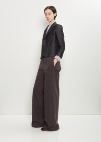 Dries Van Noten navy cropped tailored blazer with notched lapels in a wool blend jacquard. Features three patch pockets at front, two buttons closure at front, buttoned cuffs, and vent at back. Finished with self fabric covered buttons. Body lined in tonal satin fabric, sleeves lined in striped cupro fabric. Worn with: Texas Stretch Alpaca Merino Wool Sweater — Lilac , Penn Cotton Pants , and Leather Slingback Heel . Sizing: European (34-40). 34=XS, 36=S, 38=M, 40=L. Mila is 5' 9.5” (177cm) , bust 30”, waist 24”, hips 35" and wears a size 36. Color: Navy. 32% Wool, 27% Polester, 26% Cotton, 15% Linen. Lining: 100% Viscose. Sleeve Lining: 100% Cupro. Imported. FW25DVN03