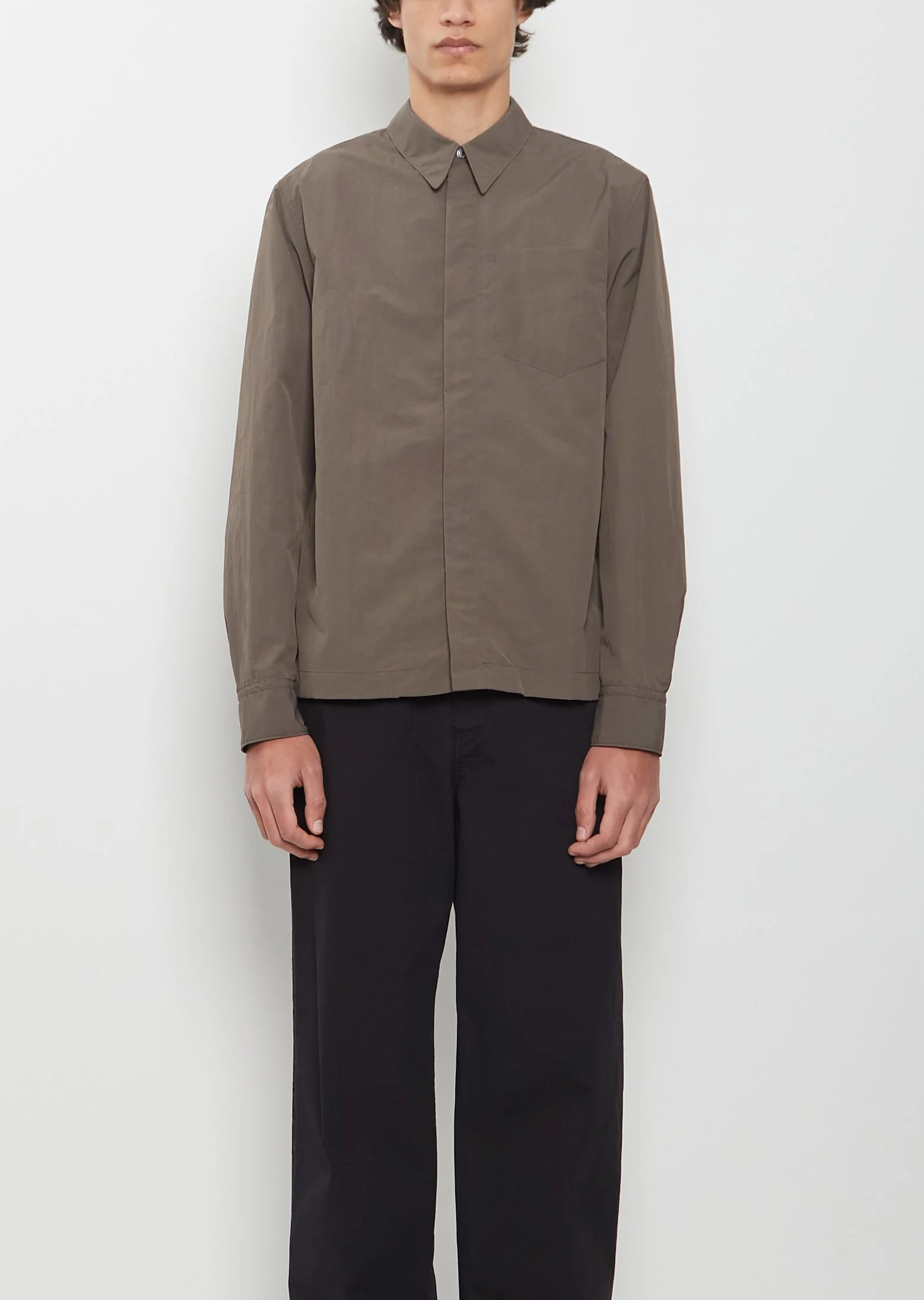 Dries Van Noten khaki brown shirt with a pointed collar and concealed zipper front placket in technical nylon. Features a single button neck closure, chest patch pocket, and buttoned cuffs. Sizing: Universal (S-XL). Stefano is 6'2" (188cm), chest 35”, waist 31”, and wears a size medium. Color: Khaki. 100% Nylon. Imported. SS26DVM19