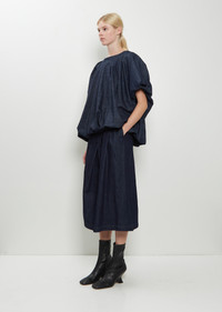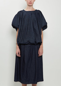Dries Van Noten indigo blue shirt with a boat neckline and a voluminous, gathered silhouette in soft cotton denim twill. Features pleating along neckline, gathering at cuffs and hem, and a tie detail at back neck. Fully lined in a smooth black viscose cupro blend twill. Sizing: Universal (XS-L). Abigail is 5' 10.5” (179cm) , bust 30”, waist 24”, hips 34” and wears a size small. Color: Indigo. 100% Cotton. Lining: 50% Viscose, 50% Cupro. Imported. FW25DVN23