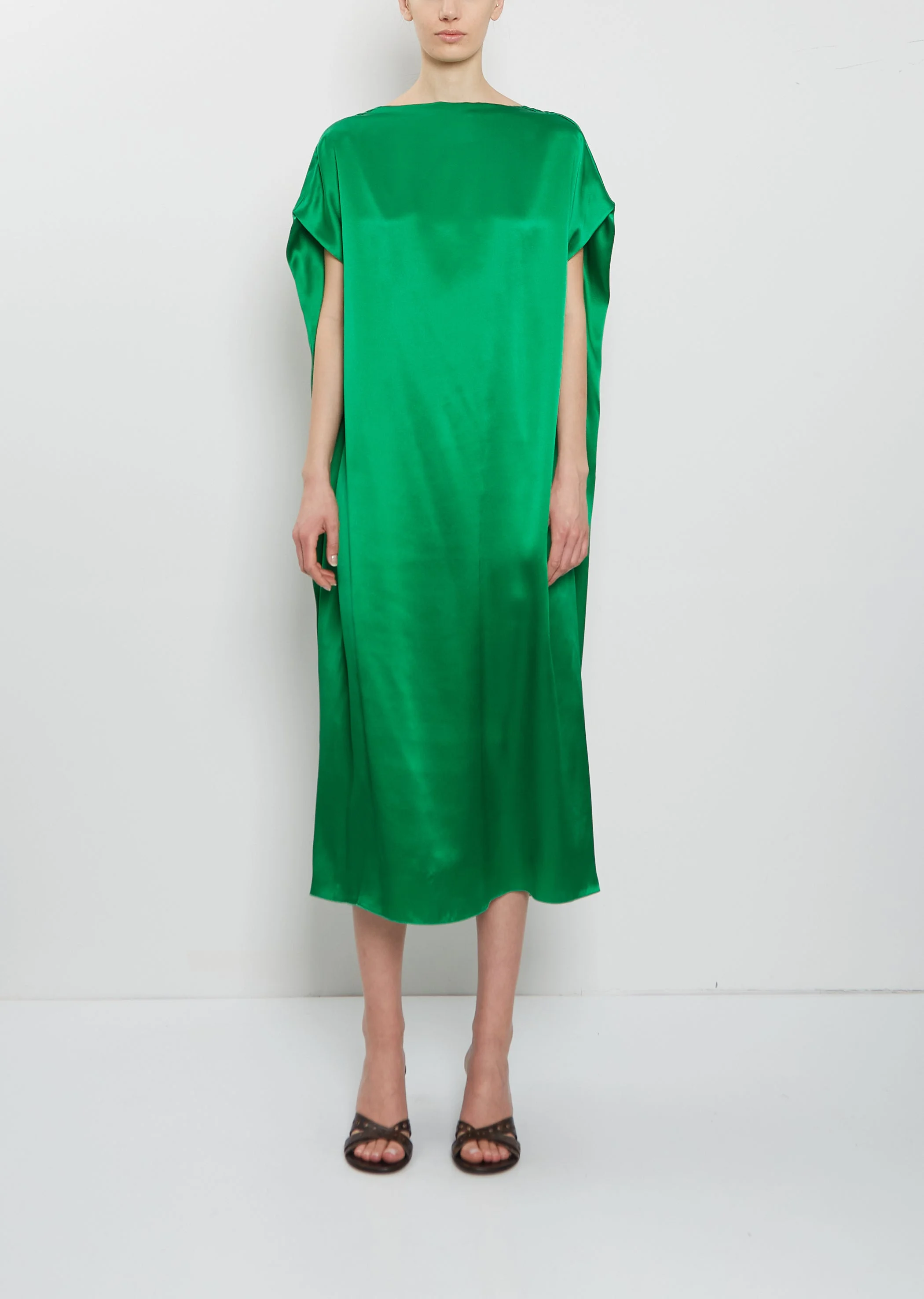 Dries Van Noten green pullover dress with a high neckline at front and deep V-neckline at back in smooth and fluid pure silk. Features cap sleeves, draping detail at sides and a straight hem. Worn with: Perforated Leather Wedge Sandal Sizing: Universal (XS-L). Angelina is 5'9.5" (177cm) and wears a size small. Color: Green. 100% Silk. Lining: 100% Silk. Imported. SS26DVN20