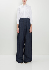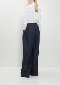 Dries Van Noten indigo blue signature wide leg pants with an elasticized high waist and front pleats in smooth cotton denim. Features angled front pockets, a faux placket, single patch pocket at back, and an interior drawcord at waist. Sizing: Universal (XS-L). Abigail is 5' 10.5” (179cm) , bust 30”, waist 24”, hips 34” and wears a size small. Color: Indigo. 100% Cotton. Imported. FW25DVN24