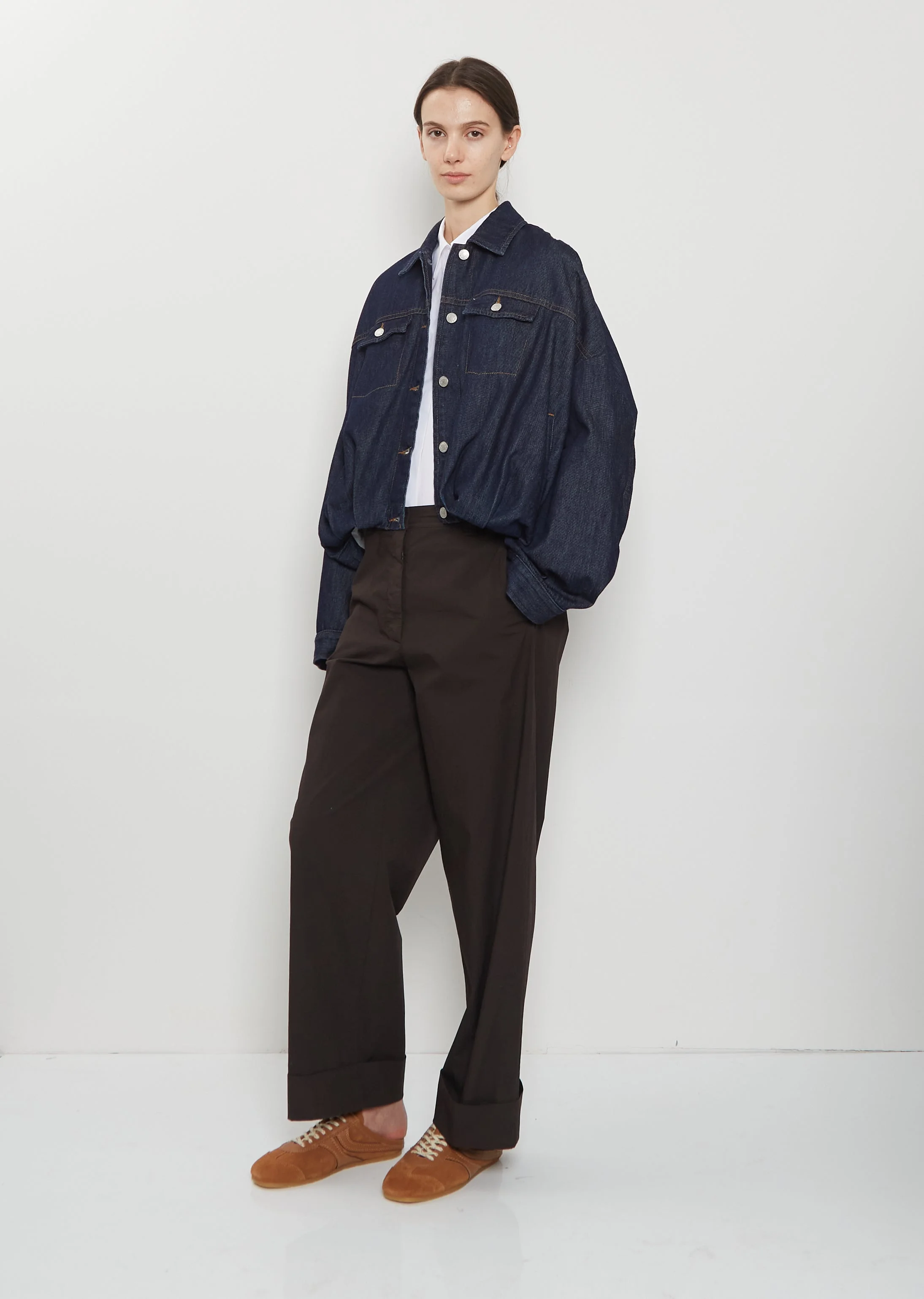 Dries Van Noten indigo blue cropped jacket with a gathered waist and a spread collar in cotton denim twill. Features dropped shoulders, buttoned flap patch pockets at chest, side welt pockets, buttoned cuffs, dart details at back, elasticated hem at back, interior patch pocket, and a stud buttons closure at front. Finished with contrasting stitching. Relaxed fit. Lined in quilted cotton. Sizing: Universal (XS-L). Oversized fit; we recommend ordering a full size down from your normal size. Angelina is 5' 9.5” (177cm), bust 34”, waist 24”, hips 35” and wears a size small. Color: Indigo. 100% Cotton. Imported. PS26DVN10