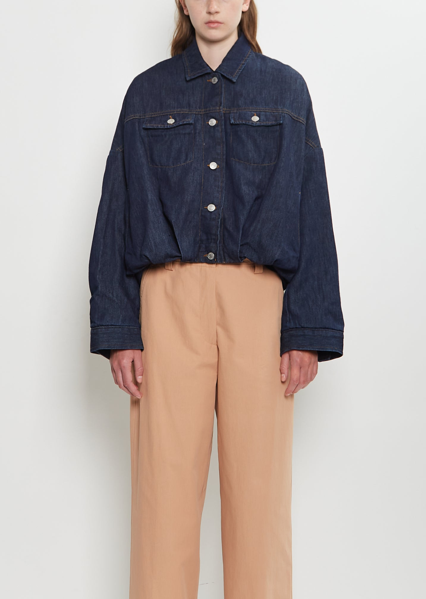 Dries Van Noten indigo blue cropped jacket with a gathered waist and a spread collar in cotton denim. Features dropped shoulders, buttoned flap patch pockets at chest, side welt pockets, buttoned cuffs, dart details at back, elasticated hem at back, interior patch pocket, and a stud buttons closure at front. Finished with contrasting stitching. Relaxed fit. Lined in quilted cotton. Worn with: Tuno Merino Wool Polo , Pakora Bis Washed Cotton Pants — Peach , and Leather Ankle Sock Boot . Sizing: Universal (XS-L). Audrey is 5'11” (180cm), bust 32”, waist 24”, hips 35” and wears a size small. Color: Indigo. 100% Cotton. Imported. FW25DVN21