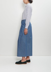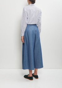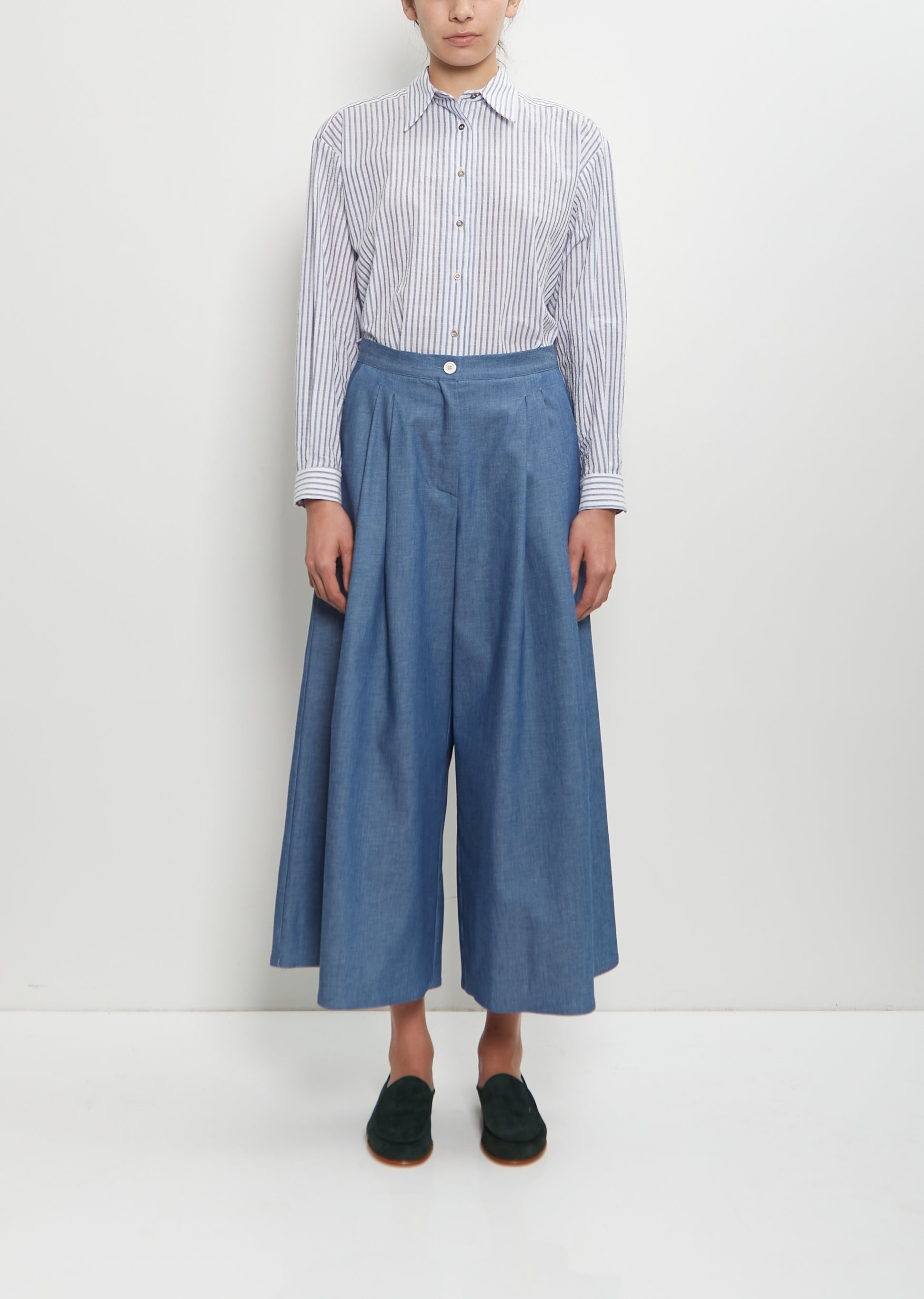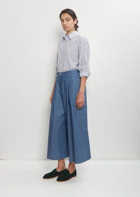 Dušan sky blue cropped pants with wide, loose legs in lightweight cotton twill. Features two front pleats, angled side pockets, darts at back and an ivory button and zip-fly fastening. Worn with: Cotton Basic Shirt and Suede Loafer — Forest . Sizing: Italian (40-44). 40=S, 42=M, 44=L. Lilly is 5’10” (177cm), bust 32", waist 24", hips 35". Color: Cielo. 100% Cotton. Made in Italy. SS25DU001