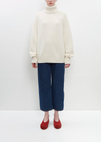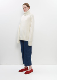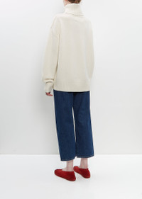 Brand Signature Piece — Extreme Cashmere chalk white oversized sweater in heavy-weight soft cashmere knit. Features a roll turtleneck, dropped shoulders, and rib trim finishings at neck, cuffs, and hem. Also available in: Pepper . Sizing: One size. Lily is 5’10” (178cm), bust 32", waist 25.5", hips 35". Color: Chalk. 100% Cashmere. Imported. PS25EX028