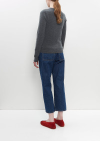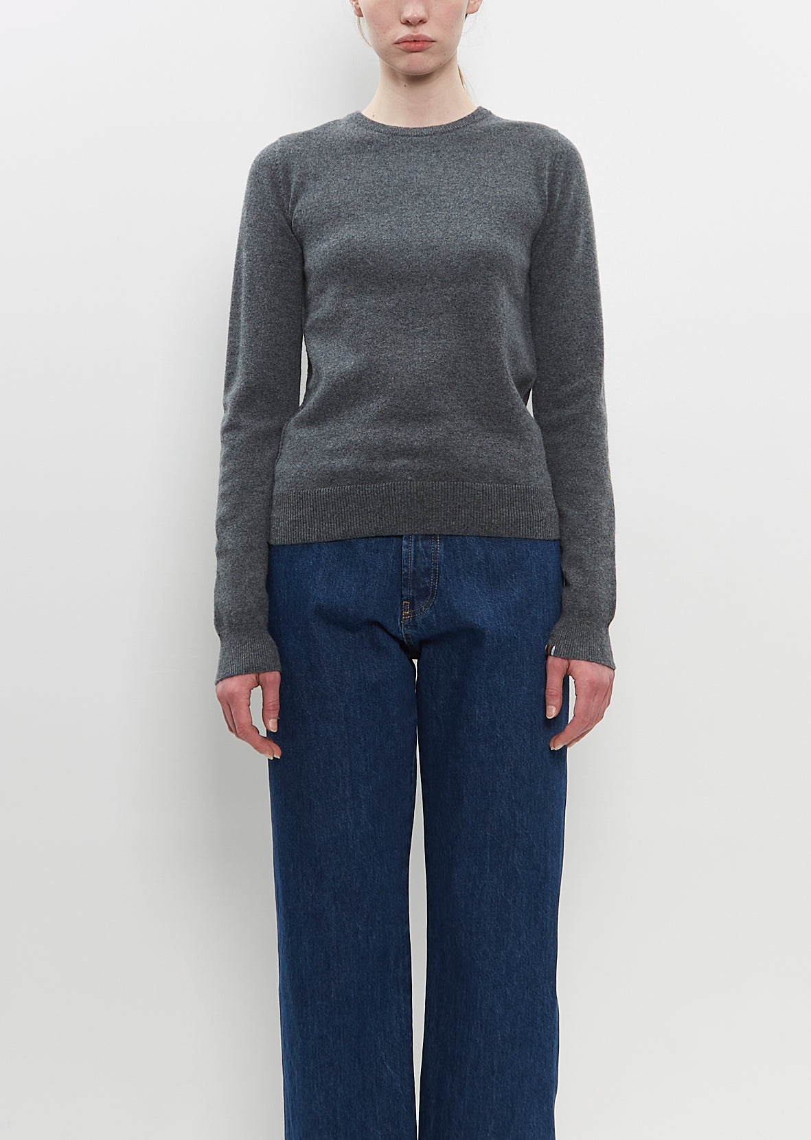 Brand Signature Piece — Extreme Cashmere dark grey classic crewneck sweater with set-in sleeves in mid-weight soft cashmere knit. Finished with rib trim at neckline, sleeve cuffs and hem. Closer fit. Also available in: Raven and Rust . Sizing: One size. Lily is 5’10” (178cm), bust 32", waist 25.5", hips 35". Color: Felt. 88% Cashmere, 10% Nylon, 2% Elastane. Imported. PS25EX022
