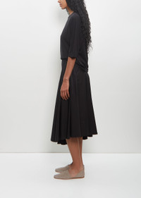 Fforme black asymmetrical A-line high-waisted pleated skirt with sculpted seams in organic and lightweight cotton poplin. Features concealed hook and eye zip fastening at side seam. Worn with: Stretch Silk Margia Fitted Draped Sheer T-Shirt . Sizing: Universal (XS-XL). Elena is 5' 9.5” (177cm), bust 32”, waist 25”, hips 34” and wears a size small. Color: Black. 100% Cotton. Lining: 100% Cupro. Made in Italy. SS25FO001
