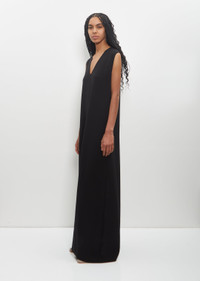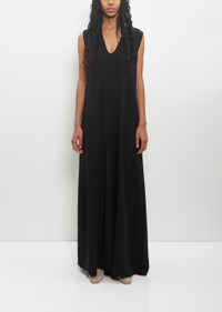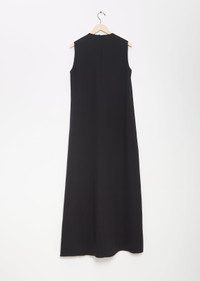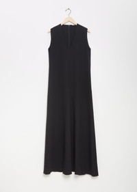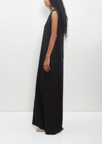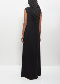 Fforme black relaxed floor-length sleeveless dress with sculptured gusset detail at front seam in silk cady. Features V-neckline and concealed zip and hook fastening at back. Lined in self. Sizing: Universal (XS-XL). Elena is 5' 9.5” (177cm), bust 32”, waist 25”, hips 34” and wears a size small. Color: Black. 100% Silk. Lining: 100% Cupro. Made in Italy. SS25FO002