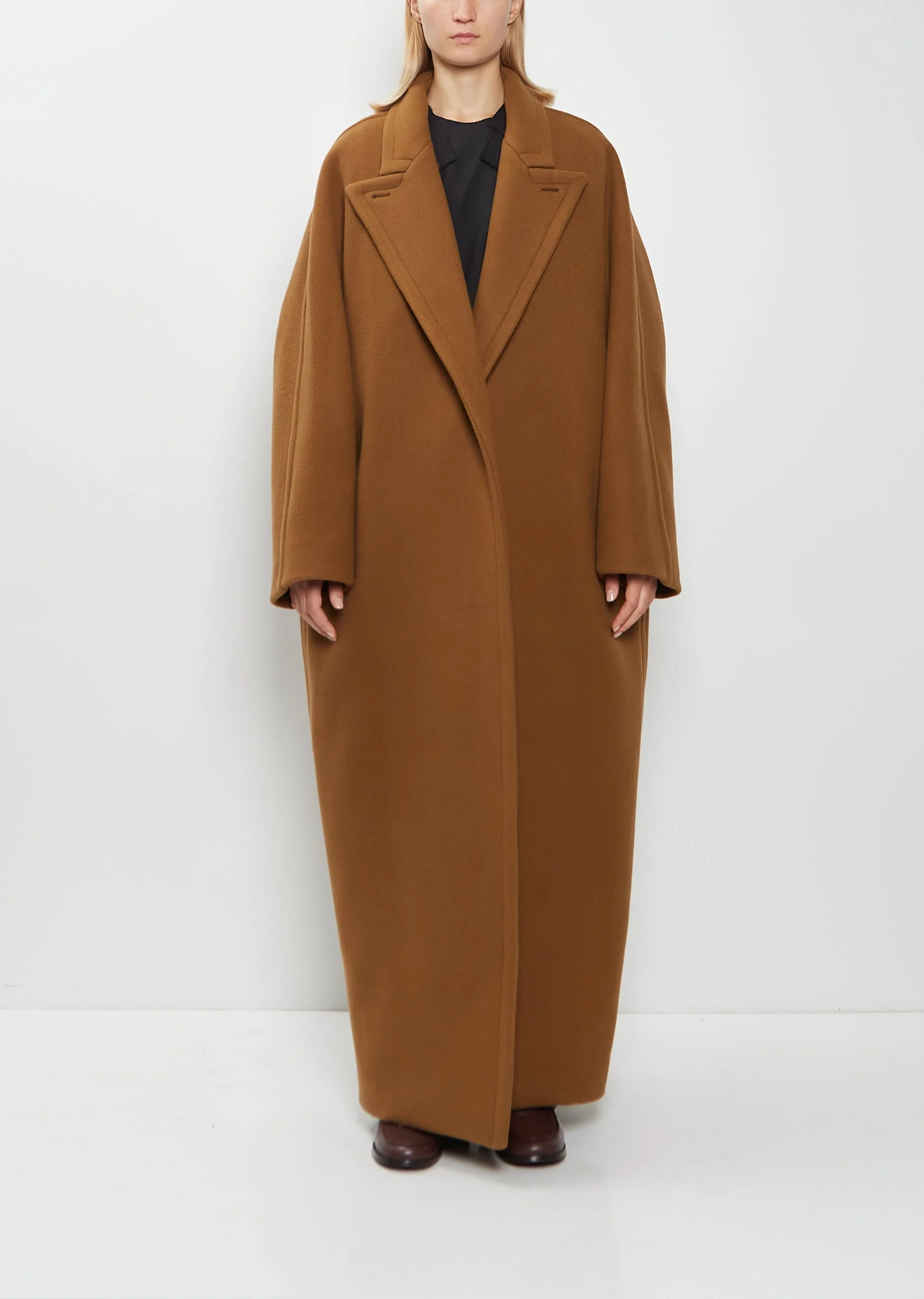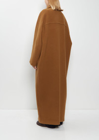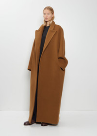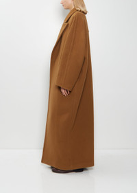 Fforme camel oversized coat with notched lapels and stand collar when buttoned in double faced wool melton. Features curved dropped shoulders, back yoke, a single interior buttoned welt pocket and a single button closure at neck. Lined in brown cupro. Worn with: Peris Wool Blend Multi Layer Top , Light Wool Jem Fitted Pants , and Leather Loafer . Sizing: Italian sizing (38-44). 38=XS, 40=S, 42=M, 44=L. Alina is 5' 9” (175cm), bust 31”, waist 23", hips 34” and wears a size 38. Color: Camel. 79% Wool, 20% Polyamide, 1% Silk. Made in Italy. FW25FO002