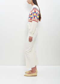 High Sport ecru crewneck sweater with raglan sleeves in cotton knit with a tricolor fair isle pattern. Features rib trim finishings at neck, cuffs and hem. Regular fit. Due to the knitting technique, there may be slight variations in length and color. Worn with: Stretch Cotton Kick Pant — Ecru and Leather Ballet Mary Jane — Custard . Sizing: Universal (XS-M). Delphine is 5’9” (175cm), bust 32", waist 24", hips 35" and wears a size small. Color: Ecru Combo. Body: 100% Cotton. Trim: 50% Cotton, 46% Polyamide, 4% Elastane. Made in Italy. HO24HS006