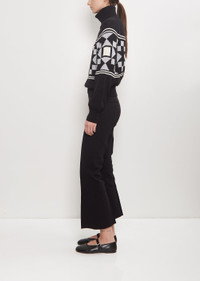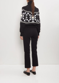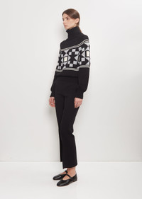 High Sport black turtleneck sweater with raglan sleeves in cotton knit with a metalized fair isle pattern. Features rib trim finishings at neck, cuffs and hem. Regular fit. Worn with: Stretch Cotton Fringed Louis Pant and Leather Ballet Mary Jane — Ecru . Sizing: Universal (XS-M). Delphine is 5’9” (175cm), bust 32", waist 24", hips 35" and wears a size small. Color: Black Combo. Body: 87% Cotton, 7% Metalized Polyester. Trim: 50% Cotton, 46% Polyamide, 4% Elastane Made in Italy. HO24HS003