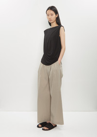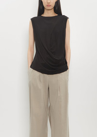 Issey Miyake black sleeveless top with asymmetrical drape detail at front in soft and fluid jersey. Features a round neckline and asymmetrical seams. Relaxed fit. Worn with: Washi Paper Ensemble U Pants and Hugh Slide — Black . Sizing: Designer's Unique Sizing (2). 2 = one size. Mingyi is 5'11” (180 cm), bust 31”, waist 23”, hips 35”. Color: Black. 72% Triacetate, 18% Polyester, 10% Polyurethane. Made in Japan. SS25IM028
