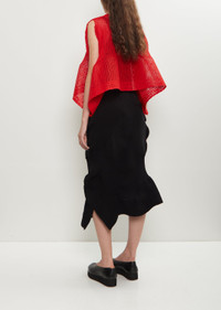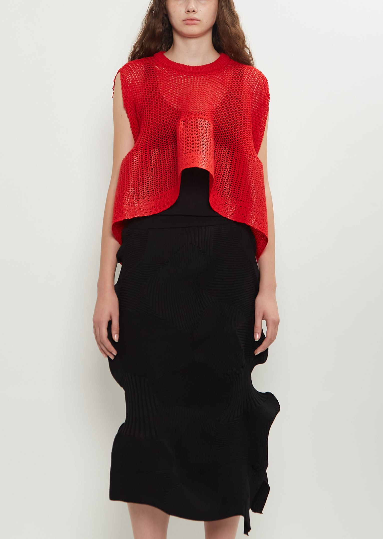 Issey Miyake red sleeveless top with a dynamic silhouette throughout in a wool alpaca blend open knit. Features a round neckline with ribbed trim finish and a flat pressed bottom hem panel that creates a crisp texture with subtle sheen. Worn with: Kone Kone Skirt and x Phileo Platform Ballerina . Sizing: Designer's unique sizing (2). 2 = One size. Measures approximately: 29.5 in Length. Athena is 5'10” (178cm), bust 30”, waist 24.5”, hips 35”. Color: Red. 62% Wool, 27% Alpaca, 11% Polyester. Made in Japan. FW25IM023