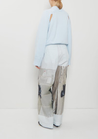 Issey Miyake pale blue pant with wide, slightly tapered legs and pleats at front woven from dense Japanese Washi paper and cotton blend twill with film photography prints of the streets of Paris. Features belt loops, darts at back waist, angled welt pockets, two welt pockets at back and a button zip-fly fastening at front. A special transfer system was used to create a poster-like texture that brings out the patterns in the photographs. Sizing: Designer's unique sizing (2 & 3). 2 = 30 in Waist, 29 in Inseam. 3 = 31 in Waist, 30 in Inseam. Alina is 5' 9” (175cm), bust 31”, waist 23", hips 34” and wear a size 2. Color: Pale Blue. 43% Washi Paper, 32% Nylon, 17% Cotton, 8% Polyurethane. Made in Japan. FW25IM027