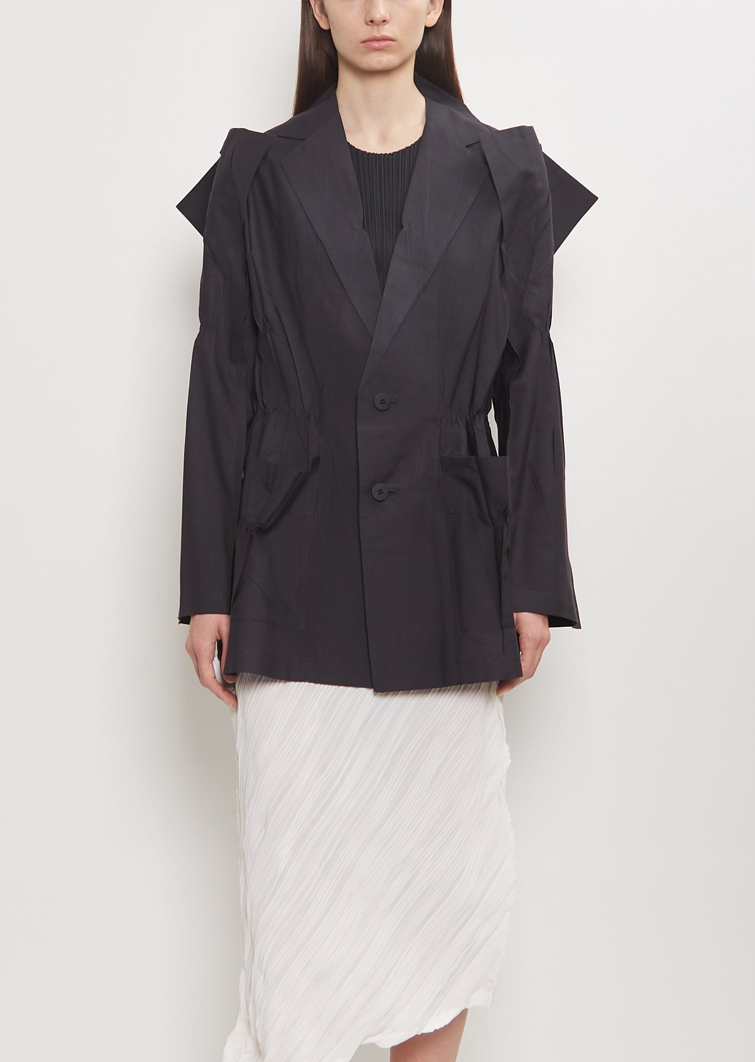Issey Miyake black single breasted jacket with notched lapels in a technical cotton fabric with a pressed effect. Features buttoned fabric shoulder details, front patch pockets with button detail, gathered details at waist and tonal two button closure at front. Comes unlined. Regular fit. Worn with: Technical Twisted Skirt and Awar Strap 25 . Sizing: Designer's Unique Sizing (2). 2 = one size. Amelia is 5' 10.5” (179cm), bust 32”, waist 24”, hips 35”. Color: Black. 56% Polyester, 43% Cotton, 1% Polyurethane. Made in Japan. SS25IM015