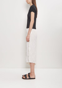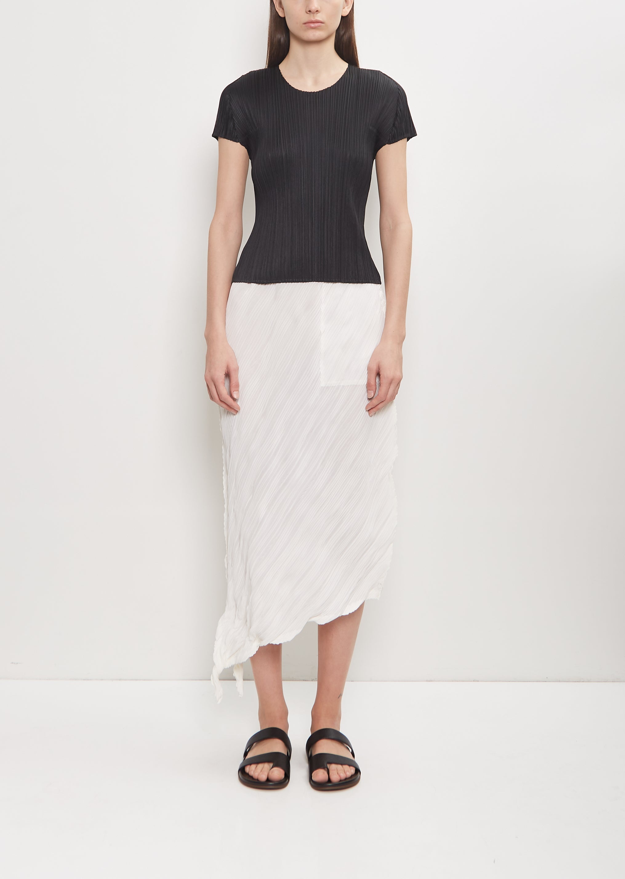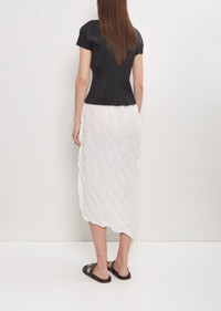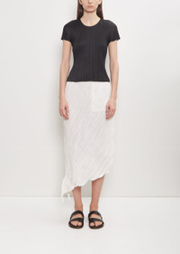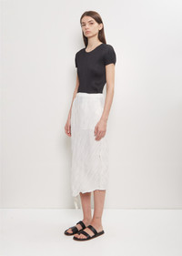 Issey Miyake white pull-on skirt with an elasticated waist and asymmetrical hem in pleated chiffon fabric with a wrinkled effect. Features a single side seam pocket and split seam at longer side hem. Worn with: Monthly Colors, April Top and Hugh Sandal . Sizing: Designer's Unique Sizing (2). 2 = one size. Amelia is 5' 10.5” (179cm), bust 32”, waist 24”, hips 35”. Color: Washi White. 100% Polyester. Made in Japan. SS25IM016
