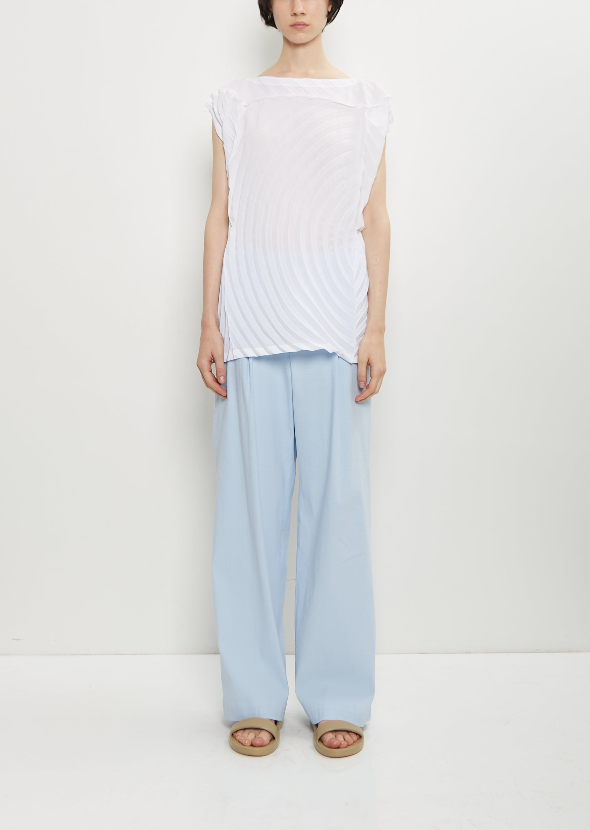Issey Miyake light blue wide leg pants with pleats at front in stretch Japanese Washi paper blend yarn. Features a curved waistline with a higher back, belt loops, angled side pockets, welt pockets at back, darts at back waist, and a tonal button and zip-fly fastening. Also available in: White and Black. Sizing: Designer's Unique Sizing (2 & 3). 2 = 30 in Waist, 29 in Inseam. 3 = 31 in Waist, 30 in Inseam. Amelia is 5' 10.5” (179cm), bust 32”, waist 24”, hips 35” and wears a size 2. Color: Light Blue. 100% Polyester. Made in Japan. FW25IMM04