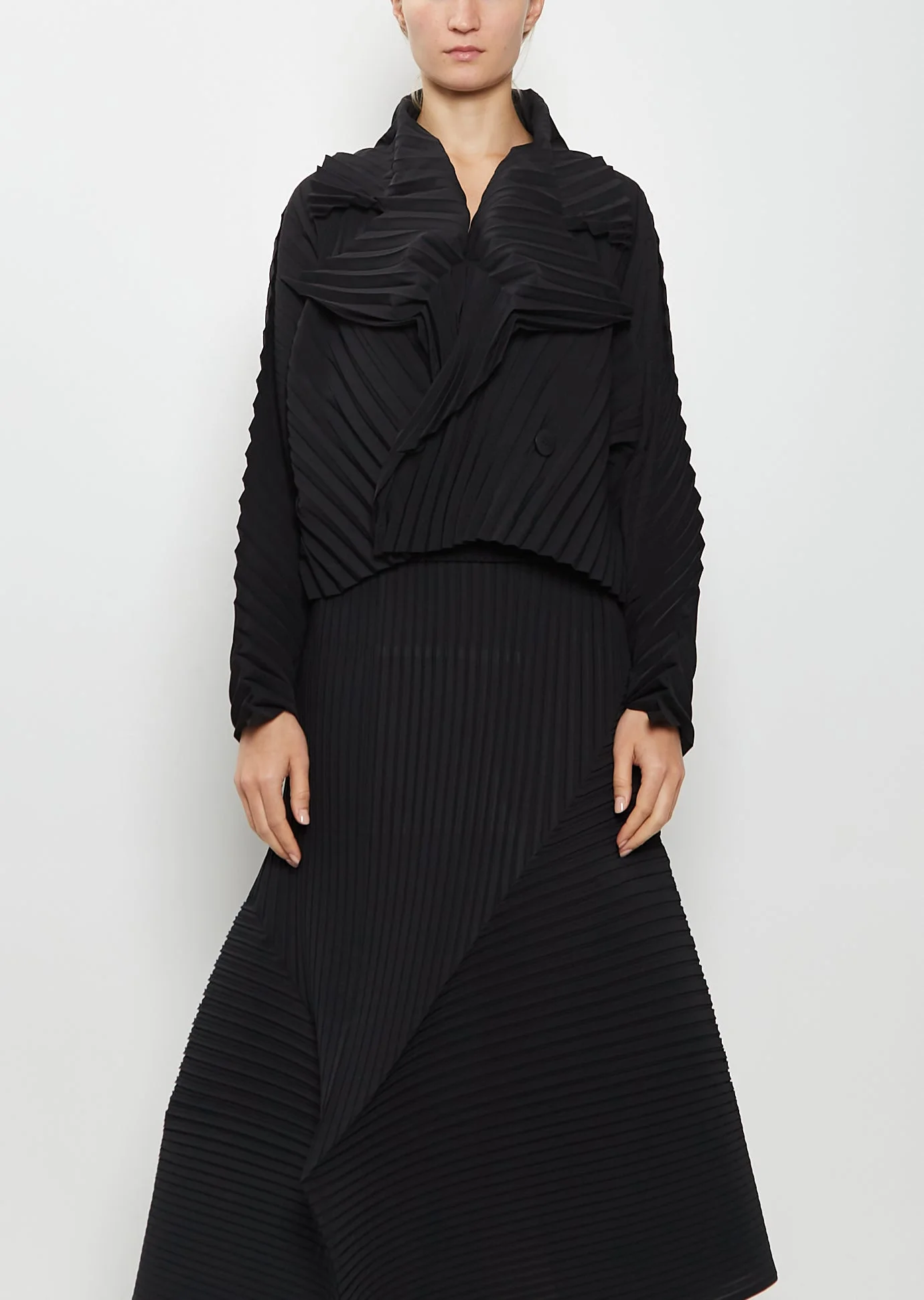 Issey Miyake black cropped double breasted jacket with an oversized notched collar and tonal button front in a pleated tightly twisted fabric. Features dropped shoulders and oversized sleeves. Relaxed silhouette. Worn with: Fold Pleats Skirt and Awar Flat — Toile . Sizing: Designer's unique sizing (2). 2 = one size. Measures approximately: 20.5 in Length, 30.3 in Sleeve Length. Alina is 5' 9” (175cm), bust 31”, waist 23", hips 34”. Color: Black. 100% Polyester. Made in Japan. FW25IM024
