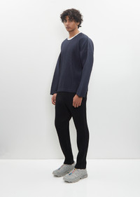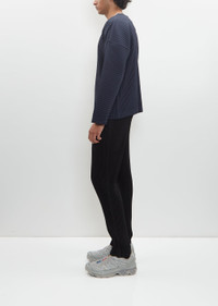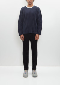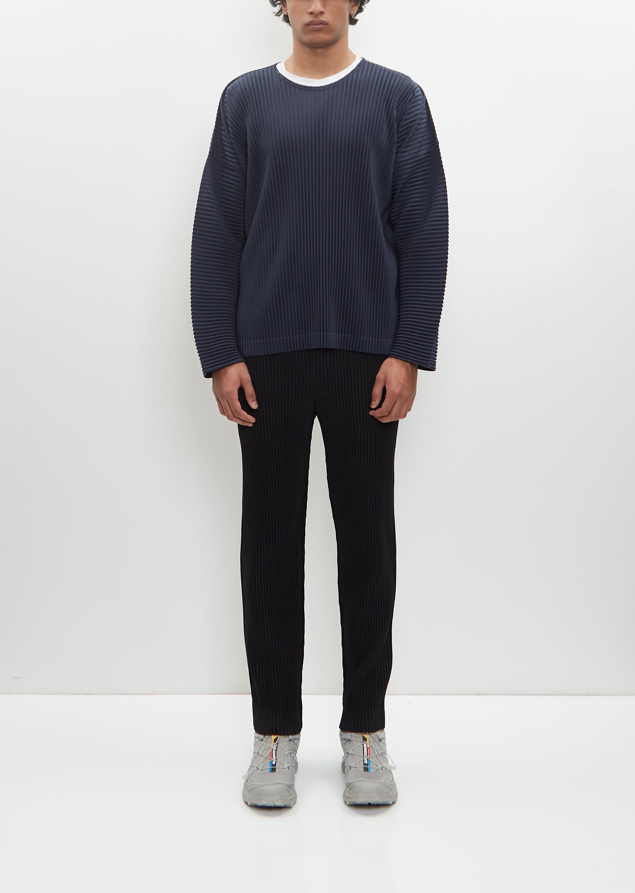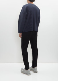 Homme Plisse Issey Miyake black trousers tailored trousers with a closer fit in pleated mid-weight wool-like textured poly fabric. Features elasticated waist, belt loops, side seam pockets, and concealed button closure. Worn with: MC January LS Shirt and XT-6 — Ghost Gray/Gray Flannel . Sizing: Designer's unique sizing (1-4). Pleats expand to fit most; sizing only refers to length of garment. Nyle is 5’11” (181cm), bust 34”, waist 27”, hips 38” and wears a size 3. Color: Black. 100% Polyester. Imported. SS25IMM02