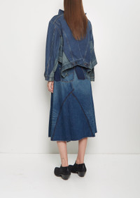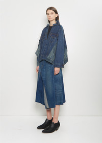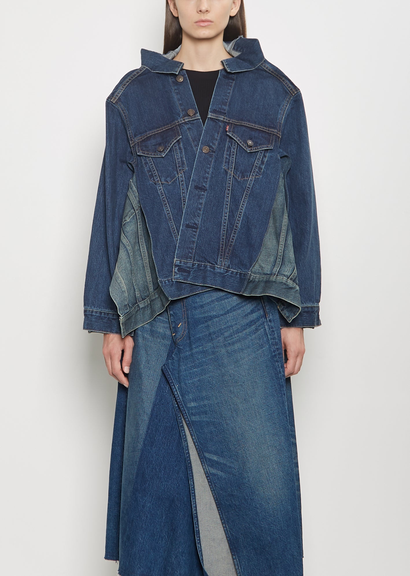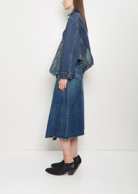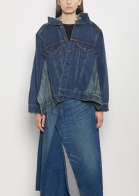 Junya Watanabe in collaboration with Levi's indigo paneled jacket with an elongated, wide open collar and side slits in cotton denim with a faded effect. Features contrasting side panels with buttoned flap pockets, buttoned flap pockets at chest, partial back yoke, and a copper-toned tack buttons closure at front. Finished with contrasting top-stitching. Comes unlined. Sizing: Universal (XS-L). Amelia is 5' 10.5” (179cm), bust 32”, waist 24”, hips 35” and wears a size small. Color: Indigo. 100% Cotton. Made in Japan. SS25JW008