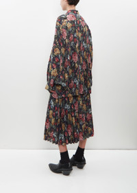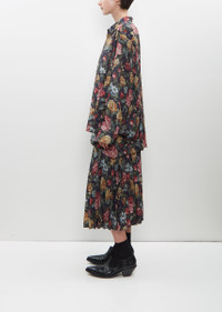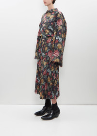 Junya Watanabe pleated skirt with a subtle A-line cut in navy and red floral printed polyester and wool blend, with a soft hand and fluid drape. Features a set-in waistband with tab and hook closure and zipper fastening on left side seam. Unlined. Sizing: Universal (XS-L). Avie is 5'10” (178cm), bust 32”, waist 23”, hips 34” and wears a size a small. Color: Navy / Red. 90% Polyester, 10% Wool. Made in Japan. FW24JW013