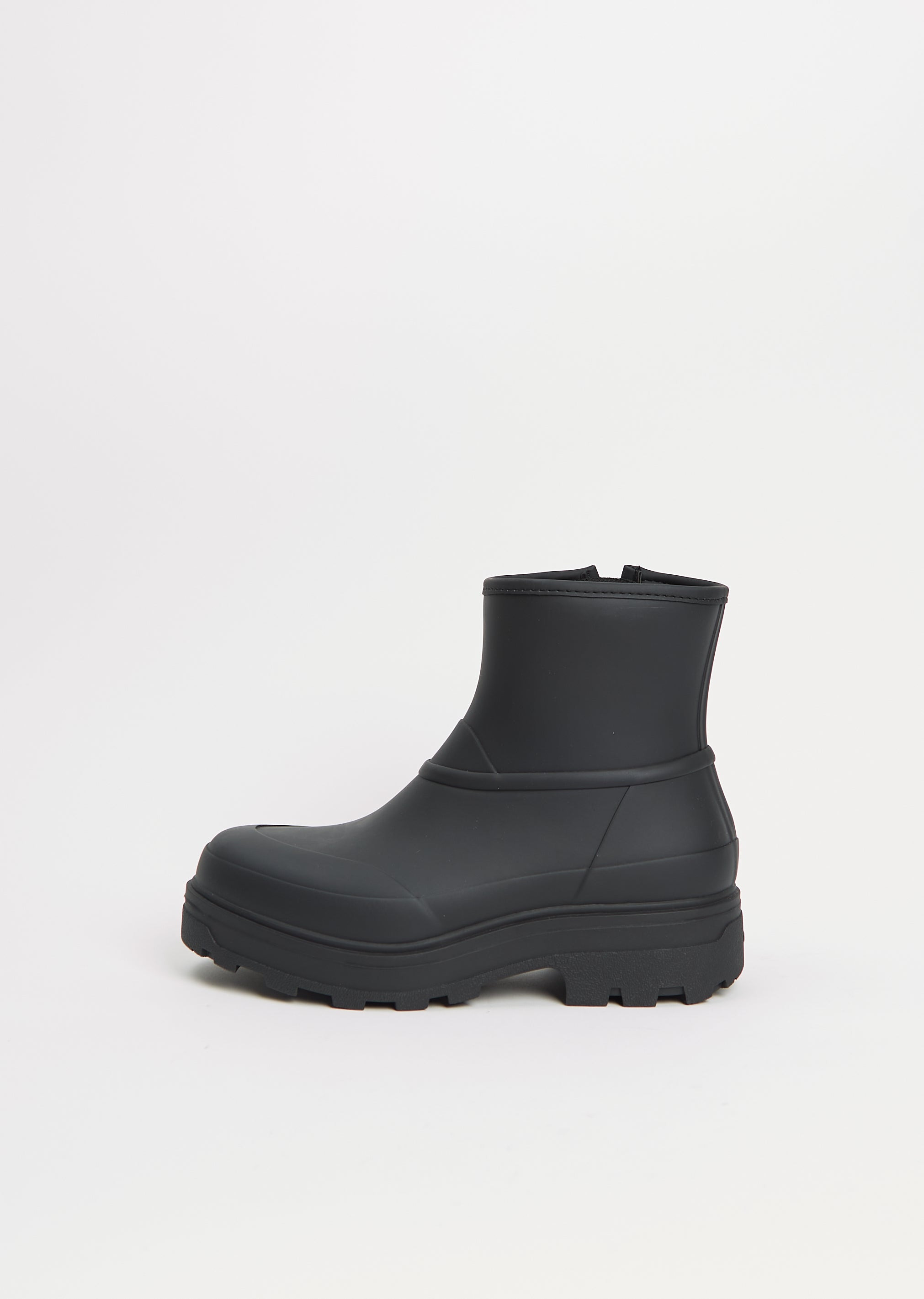 Kassl in collaboration with Tretorn black ankle boot with a chunky rubber sole in Tretorn's signature water-resistant natural rubber. Features a round toe , embossed detailing at front, a r emovable molded BLOOM® insole for comfort and side zipper closure . Lined in black in quick dry 3D-air mesh lining . Also available in: Coffee Brown . Sizing: European (36-41). Color: Black. 100% Natural Rubber. Imported. FW25CK013