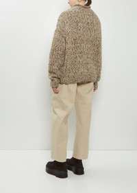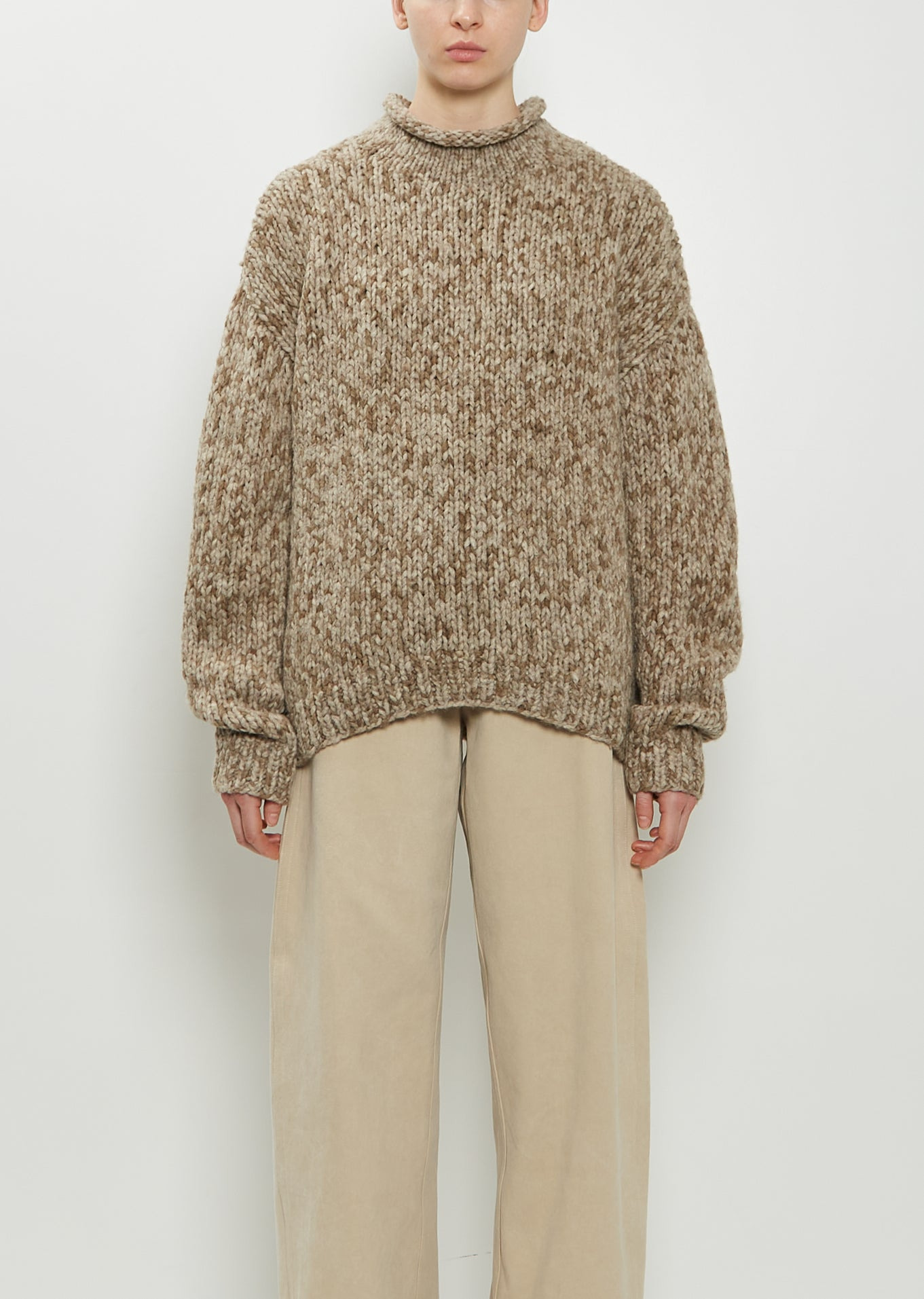 Lauren Manoogian khaki and beige sweater with a roll neckline and dropped shoulders hand-knitted in hand-painted mid-weight alpaca, merino wool, and cotton blend knit. Features ribbed trim finish at cuffs and hem. Oversized, relaxed fit. Also available in: Black Paint. Sizing: Designer's unique sizing (1). 1 = one size. Maggie is 5' 9.” (175cm), bust 32”, waist 24”, hips 34”. Color: Tobacco Paint. 40% Baby Alpaca, 40% Merino Wool, 20% Cotton. Made in Peru. FW25LM018