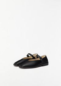 Lemaire black ballerina shoes with with Mary Jane top strap detailing in nappa leather with a shiny finish. Features a low round cut vamp, square toe on a stacked tonal leather sole. Also available in: White . Sizing: European (36-41). Heel height: .8 in. Color: Black. 100% Shiny Nappa Lamb Leather. Imported. SS25CL066