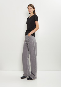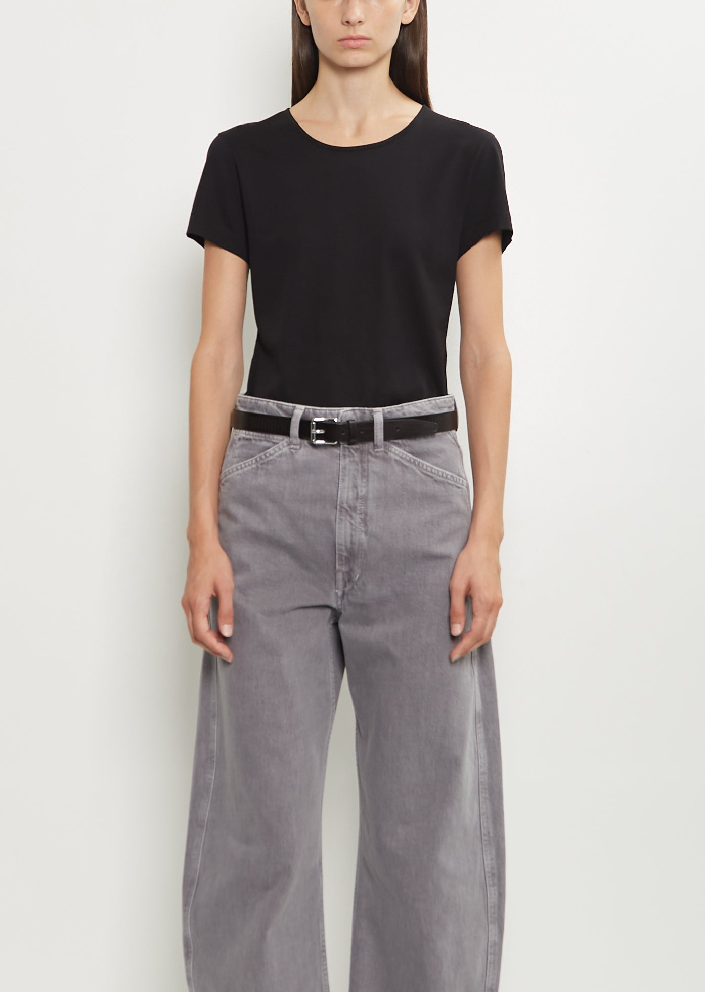 Lemaire black short sleeve t-shirt with a round neck and a closer fit in lightweight cotton jersey. Also available in: Chalk . Worn with: Cotton Denim High Waisted Curved Pants and Ballerina Shoes — White . Sizing: Universal (XXS-L). Charlotte is 5’11” (180cm), bust 33", waist 23.5", hips 36" and wears a small. Color: Black. 100% Cotton. Imported. SS25CL031