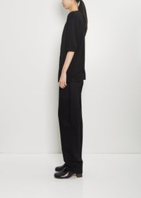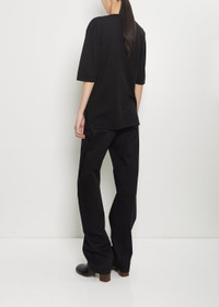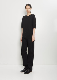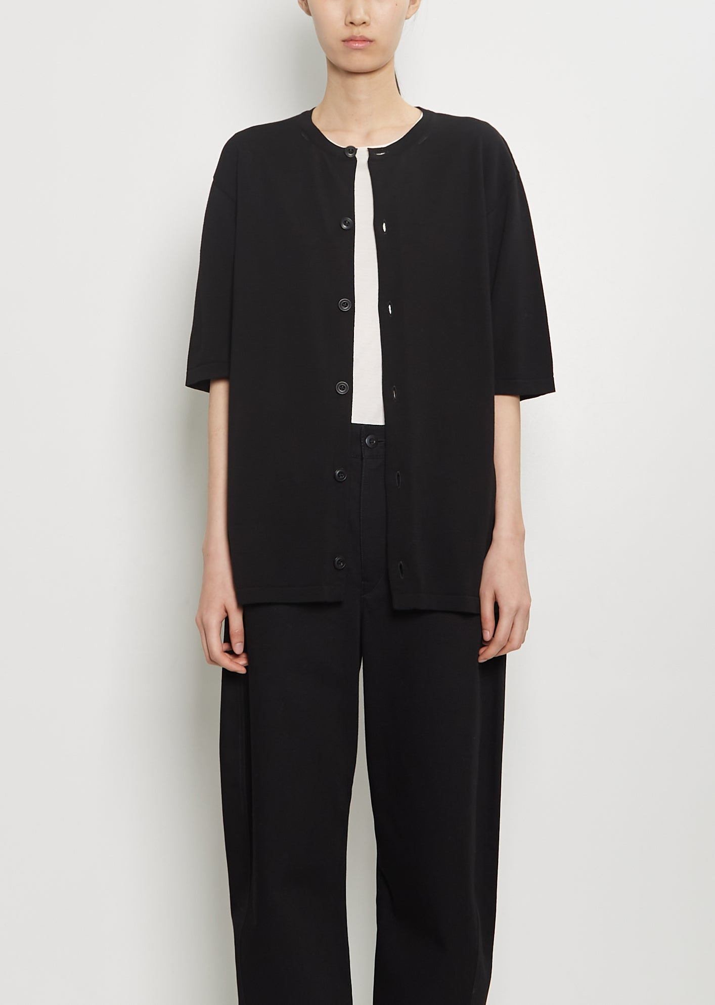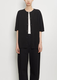 Lemaire black short sleeve overshirt with crew neckline and tonal button front in soft fine cotton crepe. Features large sleeves and ribbed trim finish at neckline, cuffs, and hem. Relaxed fit. Sizing: Universal (XXS-L). Elena is 5' 9.5” (177cm), bust 32”, waist 25”, hips 34” and wears a size small. Color: Black. 100% Cotton. Made in Italy . SS25CL041