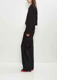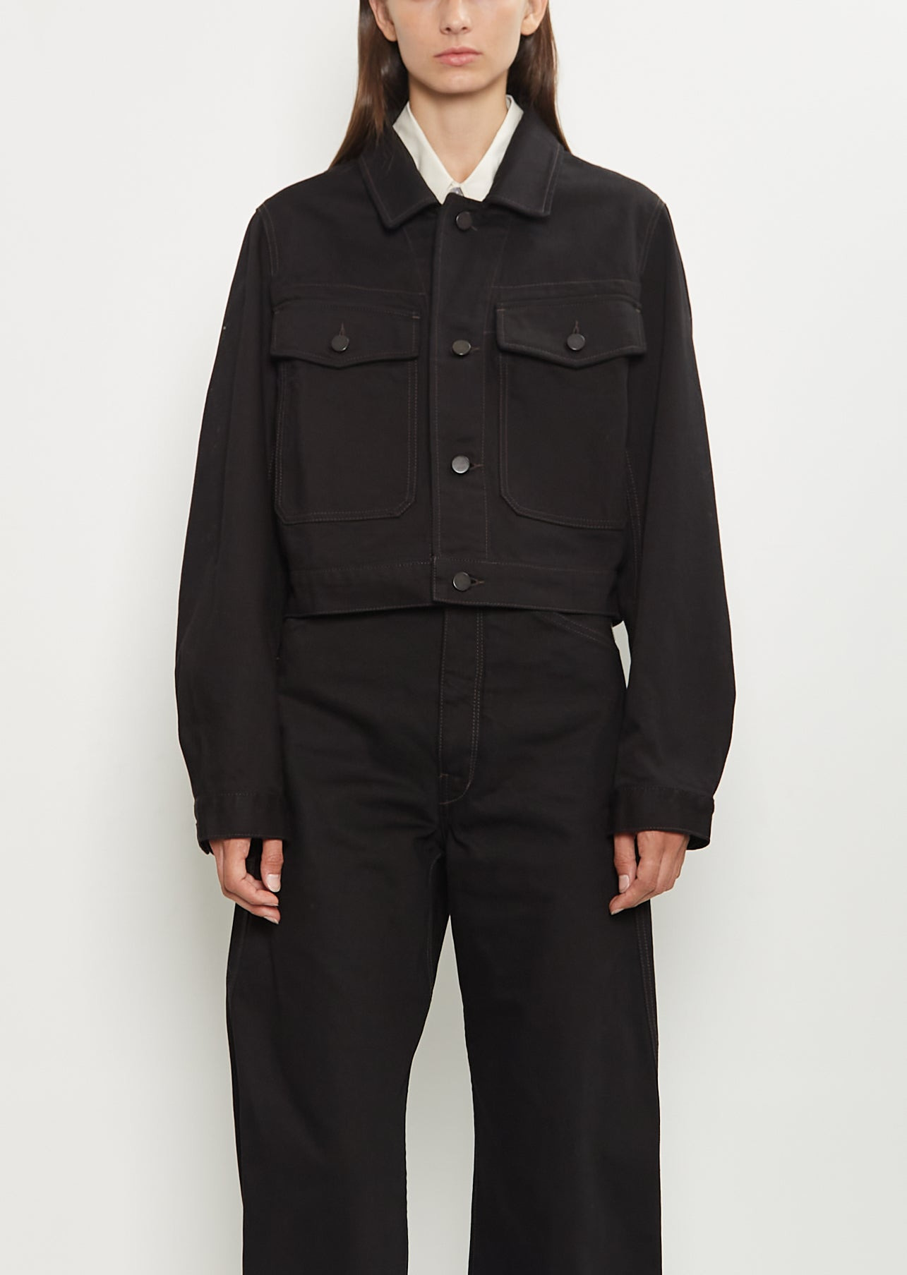Lemaire deep black cropped jacket with a classic collar and contrasting topstitching in dense cotton denim. Features two buttoned patch pockets at chest, buttoned cuffs, adjustable tabs at waist and a tack buttons closure at front. Regular fit. Worn with: Pointed Collar Cotton Silk Shirt , High Waisted Curved Denim Pants — Black , and Micro Lather Ballerina 85 . Sizing: European (32-40). 32= XXS, 34=XS, 36=S, 38=M, 40=L. Amelia is 5' 10.5” (179cm), bust 32”, waist 24”, hips 35” and wears a size 36. Color: Black. 100% Cotton. Made in Morocco. FW25CL014