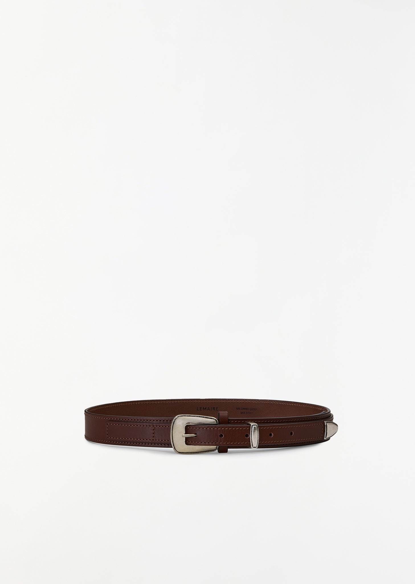 Lemaire signature western belt crafted in buffed leather in roasted pecan color. Features a d etachable buckle at pin-buckle fastening and a ntiqued gunmetal-tone hardware. Also available in: Black . Sizing: M easured from the buckle to the middle hole (85-95 cm). Width: 1.25 in. 85 cm = 33.5 in. 90 cm = 35.4 in. 95 cm = 37.4 in. Color: Roasted Pecan. 100% Leather. Made in Spain. FW24CL061