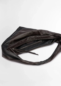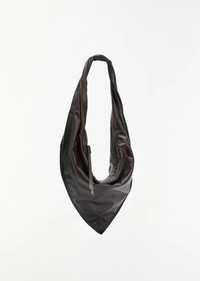 Lemaire supple bag with an oversized scarf silhouette and black trim in dark chocolate smooth nappa leather. Features a twisted shoulder strap, single interior zip pocket, tassel zip-top pull and silver-tone metal hardware throughout. Fully lined in tonal leather. Also available in: Off White . Measures approximately: 22 W x 13.5 H x 1.5 D in. Strap drop: 16.5 in. Color: Black / Dark Chocolate. 100% Leather. Imported . FW25CL052