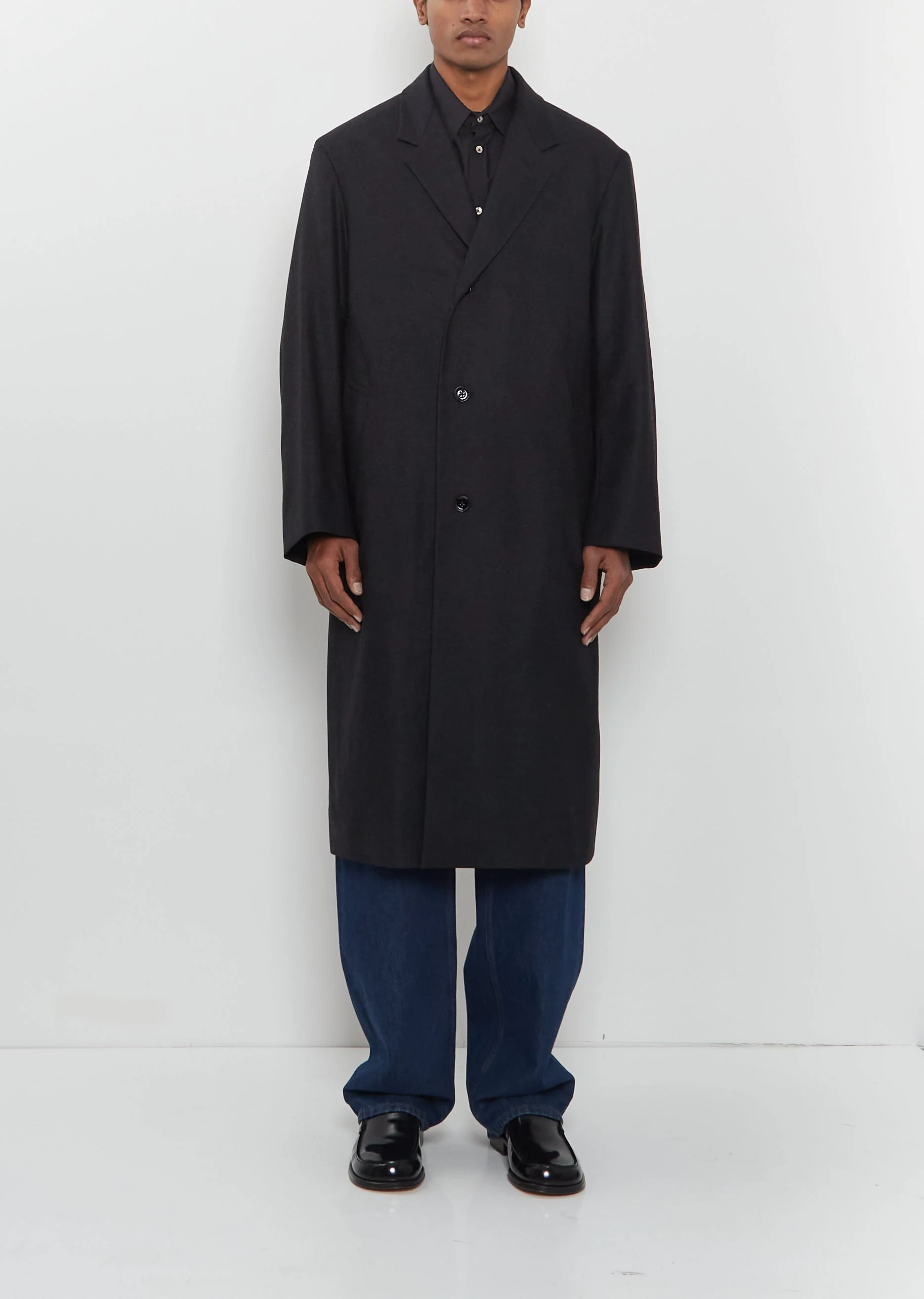 Lemaire anthracite grey single breasted coat with a convertible notched collar and tonal button front in a light cashmere blend. Features dropped shoulders, angled welt pockets, and interior welt pockets. Lined in tonal cotton blend fabric. Oversized fit. Sizing: Universal (XS-XL). Deepak is 6'1" (185cm), chest 36.5”, waist 28.5” and wears a size medium. Color: Anthracite / Grey. 50% Cashmere, 47% Polyamide, 3% Wool. Lining: 51% Cotton, 49% Viscose. Second Lining: 100% Cotton. Imported. FW25CLM08