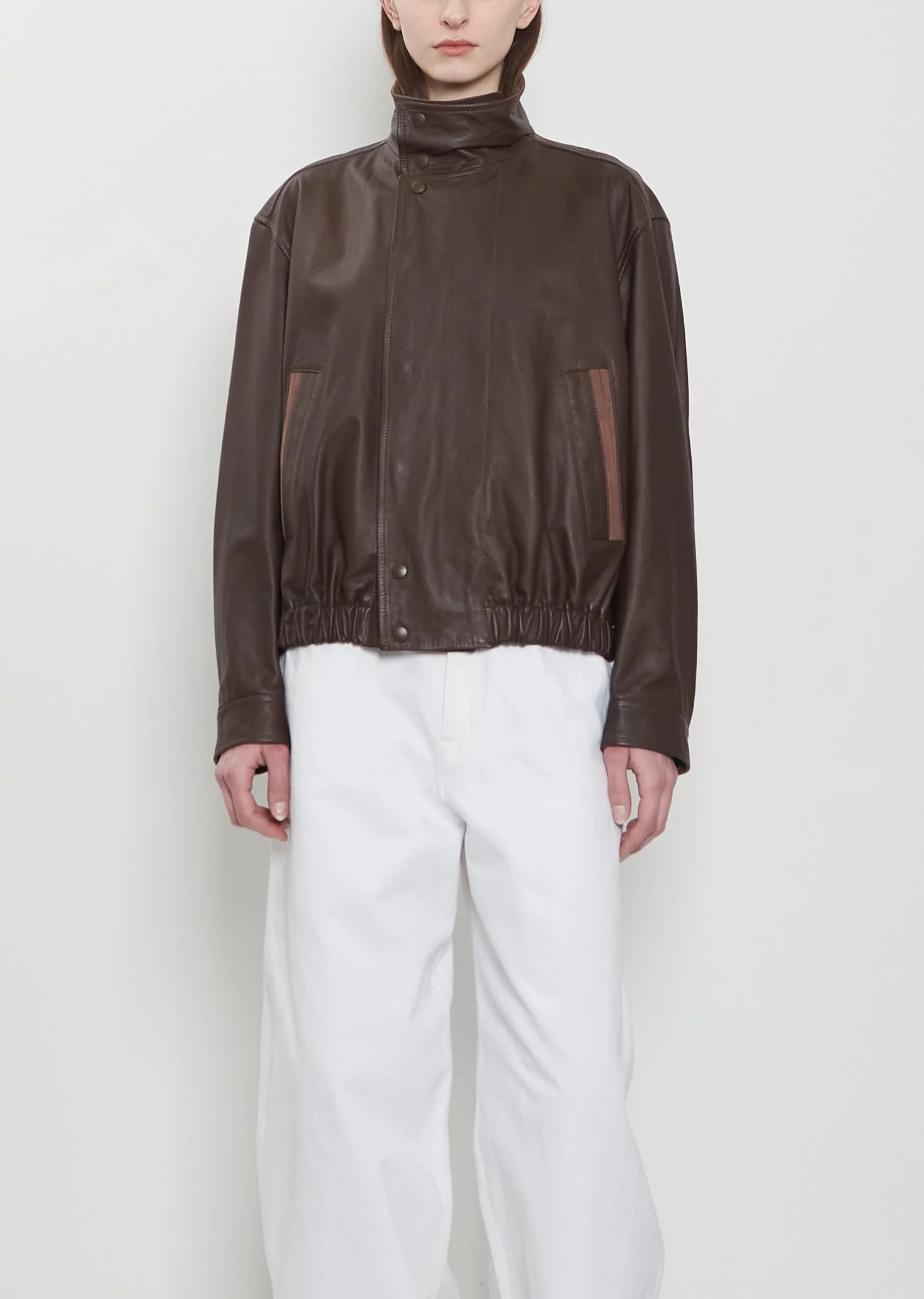 Lemaire chocolate brown jacket with a stand collar and side welt pockets in soft Paper leather. Features contrasting panels at sleeves and pockets, dropped shoulders, buttoned cuffs, an elasticated hem, back yoke, snap buttons closure at front and a concealed zipper closure. Fully lined in tonal cotton blend fabric. Relaxed fit. Sizing: Universal (XXS-L). Violet is 5' 11” (180 cm), bust 32.5”, waist 23.5”, hips 35” and wearing a size small. Color: Chocolate. 100% Cow leather. Lining: 51% Cotton, 49% Viscose. Imported. SS26CL067