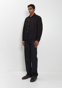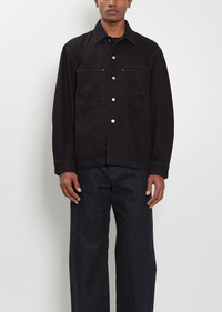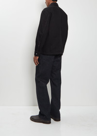 Lemaire black overshirt with a classic collar and metal button closure in mid-weight cotton denim. Features dropped shoulders, a double chest patch pocket at left, regular chest patch pocket at right, and buttoned cuffs. Also available in: Moss Green. Sizing: European (44-52). 44=XS, 46=S,48=M, 50=L, 52=XL. Deepak is 6'1" (185cm), chest 36.5”, waist 28.5”, and wears a size 46. Color: Black. 100% Cotton. Imported. FW25CLM15