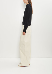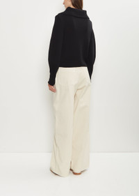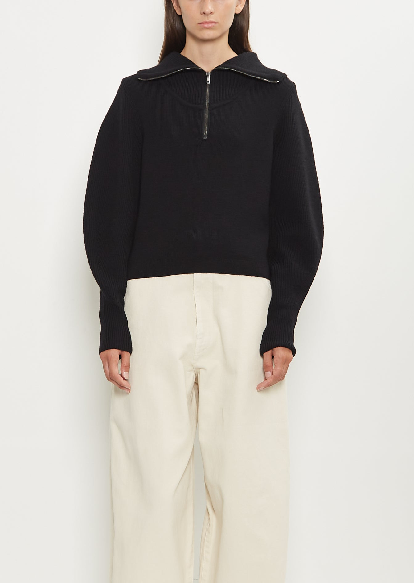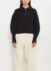 Lemaire black sweater with a 3/4 zippered high neck collar in mid-weight wool knit. Features set-in shoulders, curved sleeves, and ribbed trim finishings at neck, cuffs, and hem. Regular fit. Worn with: Cotton Denim Large Pants and Ballerina Shoes — White . Sizing: Universal (XXS-L). Amelia is 5' 10.5” (179cm), bust 32”, waist 24”, hips 35” and wears a size extra small. Color: Black. 100% Wool. Made in Portugal. FW25CL020