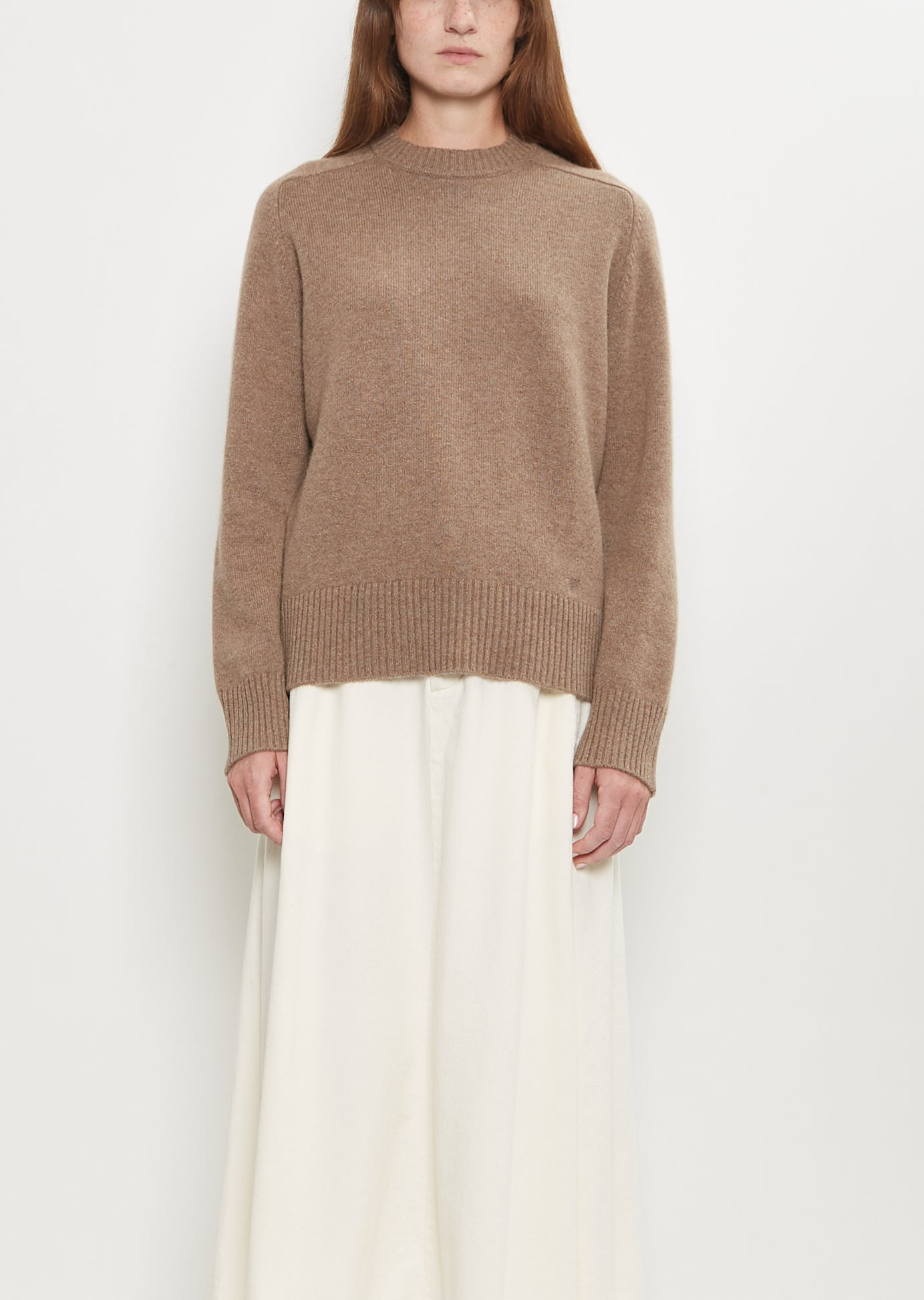 Loulou de Saison taupe melange long sleeve sweater with a crew neck and dropped shoulders in mid-weight cashmere knit. Features wide rib trim finish at neckline, cuffs, and hem. Finished with the brand’s signature seashell-logo embroidery at hem. Also available in: Anthracite Melange . Sizing: Universal (XS-L). Color: Taupe Melange. 100% Cashmere. Made in Italy. FW25LL004