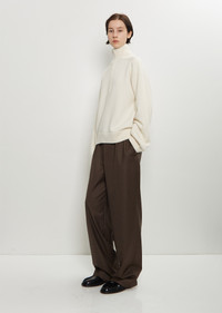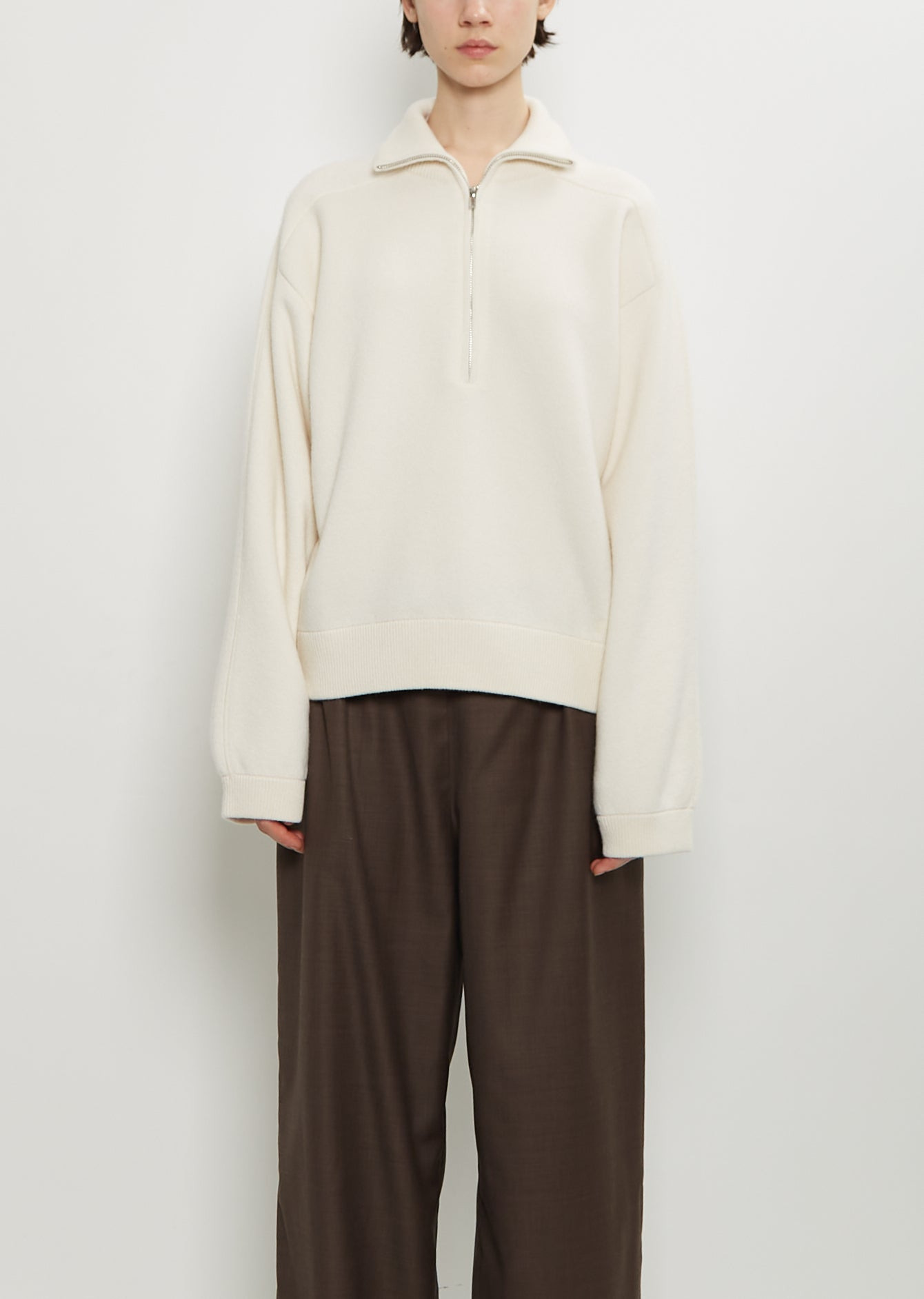 Loulou de Saison ivory sweater with a turtleneck and half closure in soft cashmere French terry. Features raglan sleeves, and ribbed finishings at neck, cuffs and hem. Finished with the brand’s signature seashell-logo embroidery at hem. Straight, regular fit. Sizing: Universal (XS-L). Mila is 5' 9.5” (177cm) , bust 30”, waist 24”, hips 35” and wears a size small. Color: Ivory. 100% Cashmere. Imported. FW25LL013