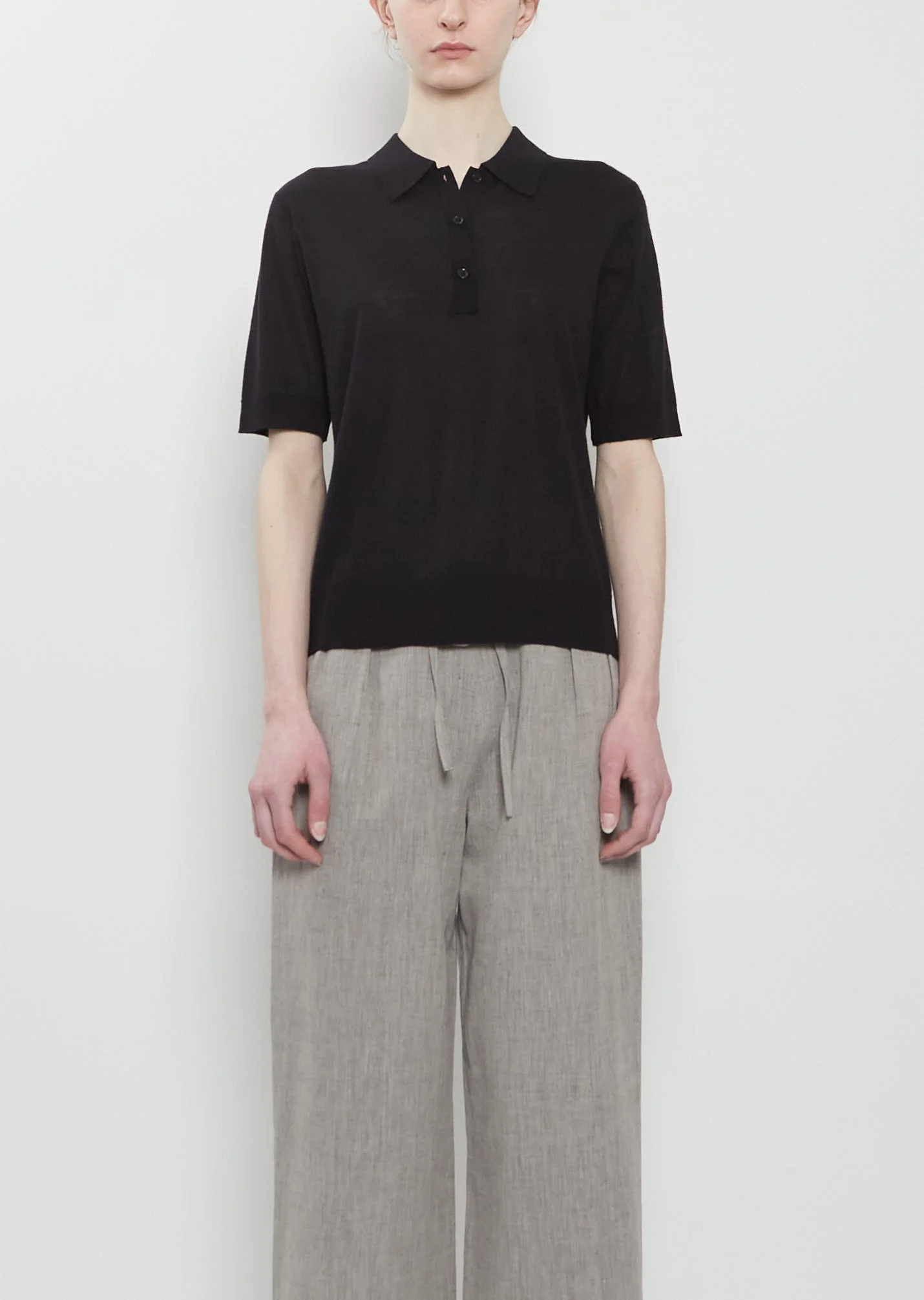 Loulou de Saison black polo shirt with a spread collar in fluid and fine cashmere knit. Features a three tonal button placket and ribbed trim finishings at collar, cuffs and hem. Relaxed fit. Also available in: Ivory. Sizing: Universal (XS-L). Color: Black. 100% Cashmere. Made in Italy. SS26LL027