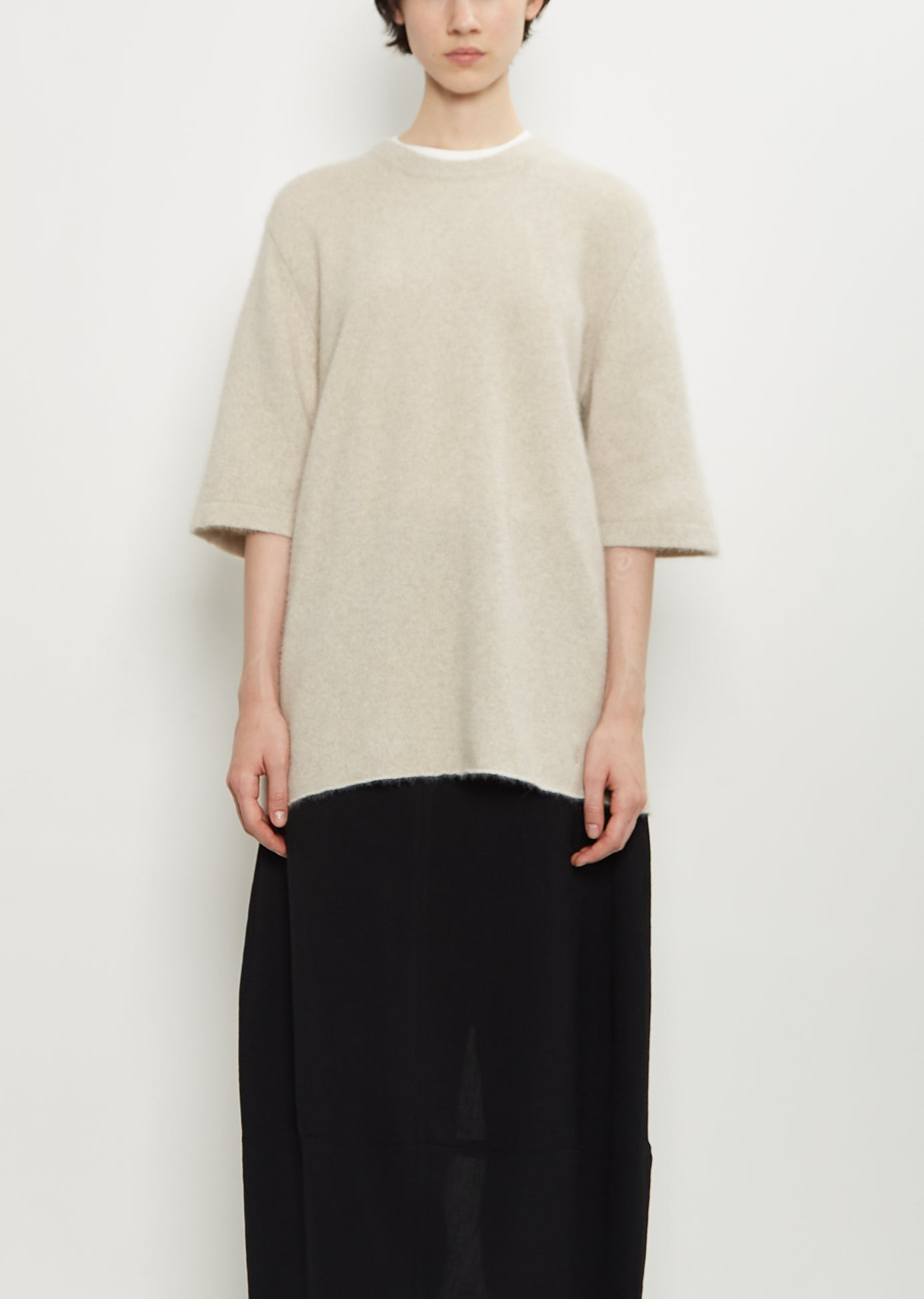 Loulou de Saison stone beige short sleeve sweater with a round neckline and dropped shoulders in lightweight soft mercerized wool and yak blend knit. Finished with a ribbed trim along neck and cuffs, and overlock at hem. Relaxed fit. Also available in: Black and Anthracite Melange. Worn with: Marine Cotton Tee — Off White and Beni Twill Round Skirt. Sizing: Universal (XS-L). Mila is 5' 9.5” (177cm) , bust 30”, waist 24”, hips 35” and wears a size small. Color: Stone Melange. 50% Mercerized Wool, 40% Yak, 10% Nylon. Imported. FW25LL019