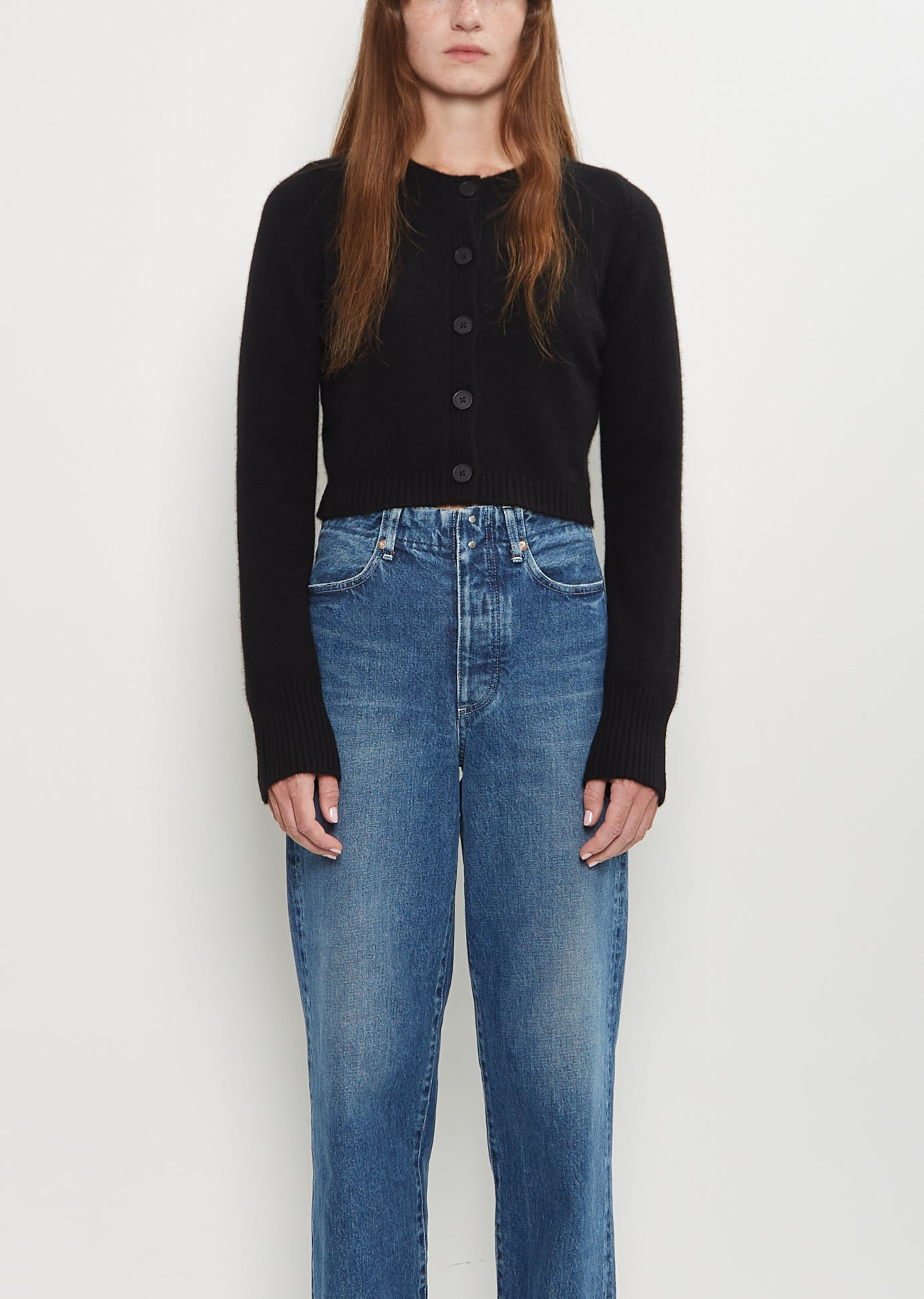 Loulou Studio black cropped cardigan with round neck in mid-weight pure cashmere. Features a rib trim at neckline, placket, cuffs, and hem. Finished with a tonal buttons closure at front and signature embroidered shell at bottom left. Also available in: Ivory . Sizing: Universal (XS-L). Color: Black. 100% Cashmere. Made in Italy. FW25LL001