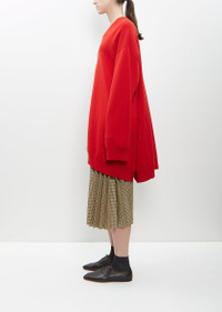 Marie Adam-Leenaerdt red asymmetrical sweater dress that can be worn in two ways either using front or back skirt in mid-weight wool knit. Features a V-neck, dropped shoulders, elongated sleeves, a closer fit at back and rib trim finishings at neck, cuffs and both bottom hems. Relaxed fit. Worn with: Houndstooth Poly Pleated Skirt and Hereditas Lace Up — Laquer Brown . Sizing: Universal (XS-L). Heva is 5’11” (180cm), bust 32", waist 23", hips 35" and wears a size small. Color: Red. 100% Wool. Made in Italy. PS25MAL04